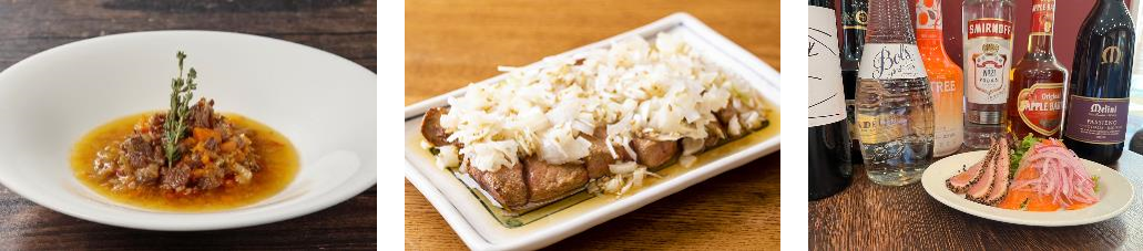 左:PIZZA SALVATORE CUOMO & GRILL 牛スジの煮込みトスカーナ風+生ビールorスパークリングワインなどから1杯