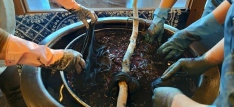 天然灰汁発酵建て阿波藍染めで、ハンカチ(約90分1650円~)やコットンバック、Tシャツを染めて、その魅力にふれてはいかがでしょう。