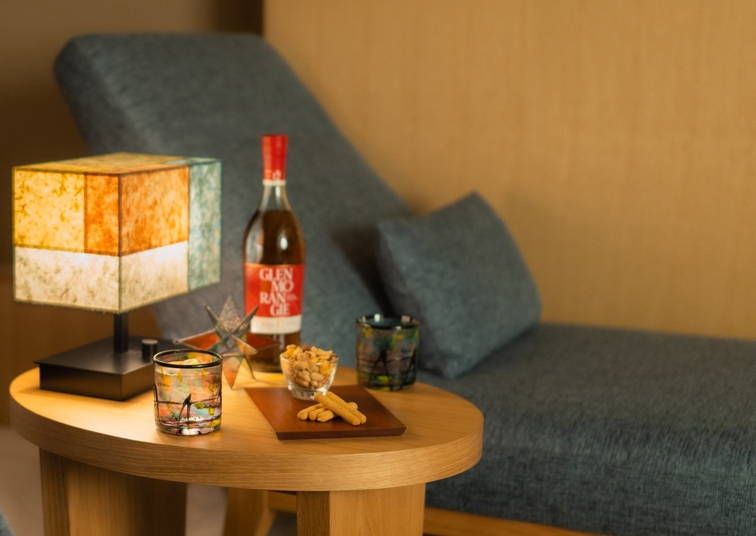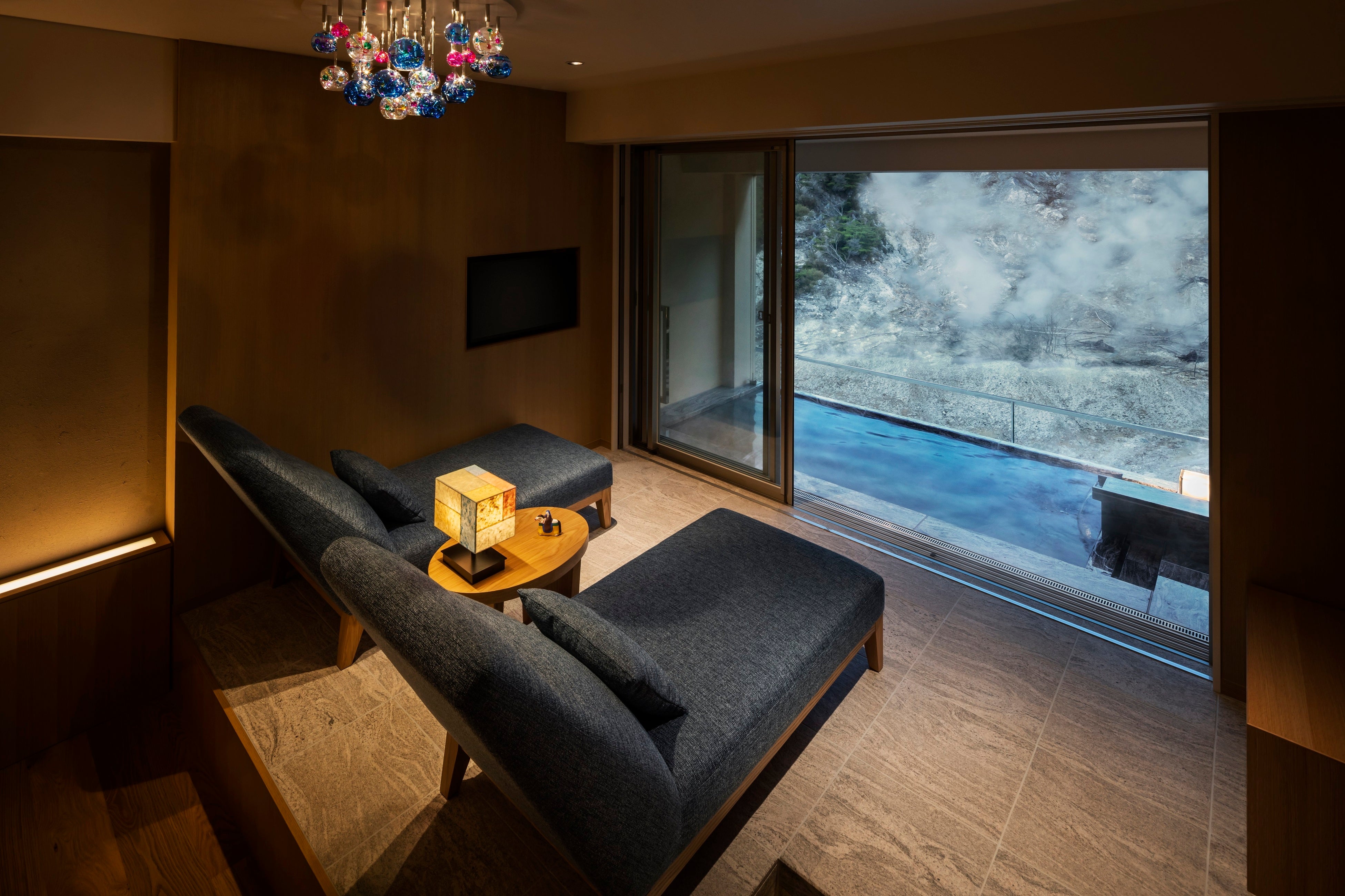 界 雲仙には、湯浴みを中心に滞在できる客室として「客室付き露天風呂」があります。入浴と休息に集中できるよう露天風呂とベッドルームの境界に「湯上がり処」を設け、開かれた景色に向かい湯上がりチェアで寛ぐ時間を演出します。雲仙地獄からの湯けむりを感じ、贅沢な時間を彩るアペロは長崎県の地酒スパークリングと南蛮菓子。酒器にはステンドグラスのグラスを使用し、多様な表情を見せる雲仙地獄を見下ろしながら、ゆったりとした時間を過ごせます。