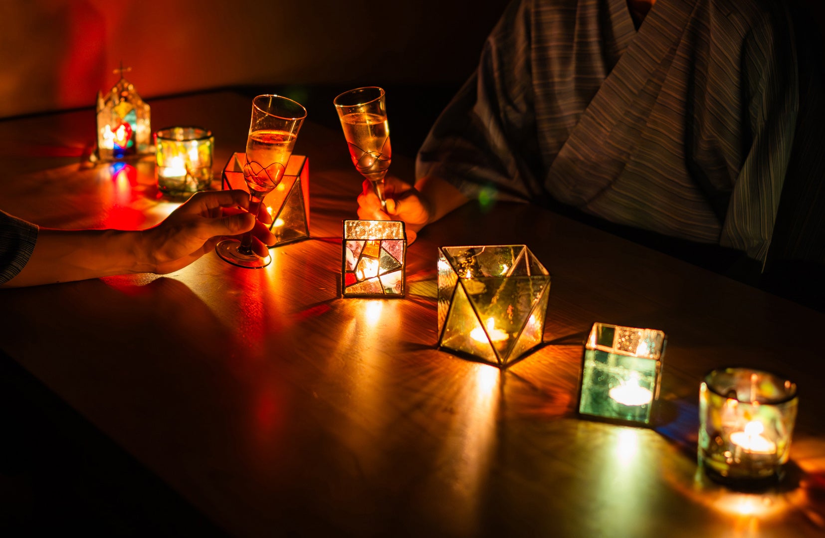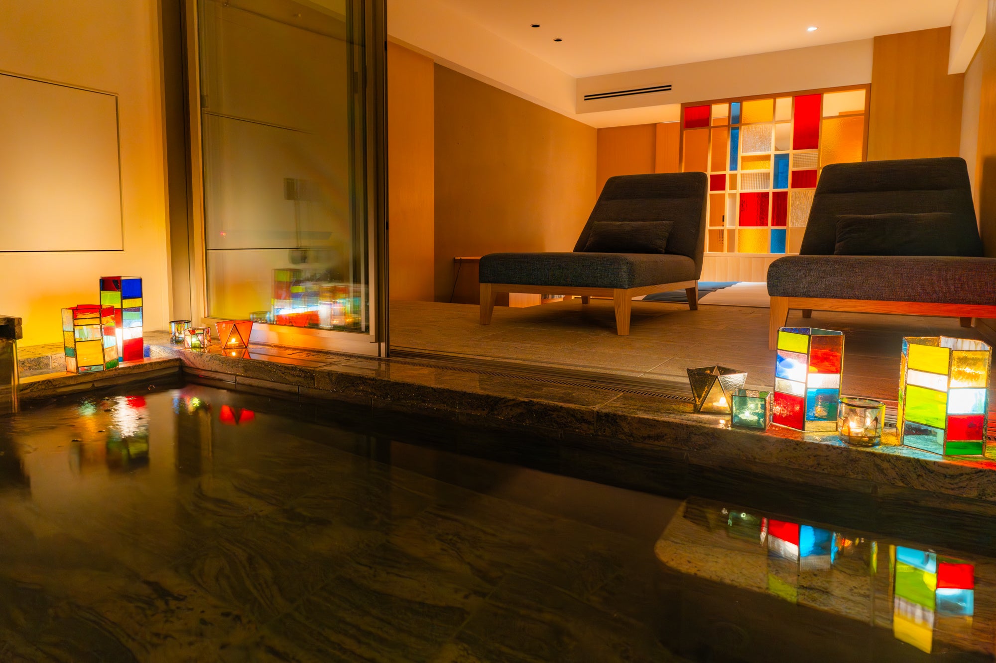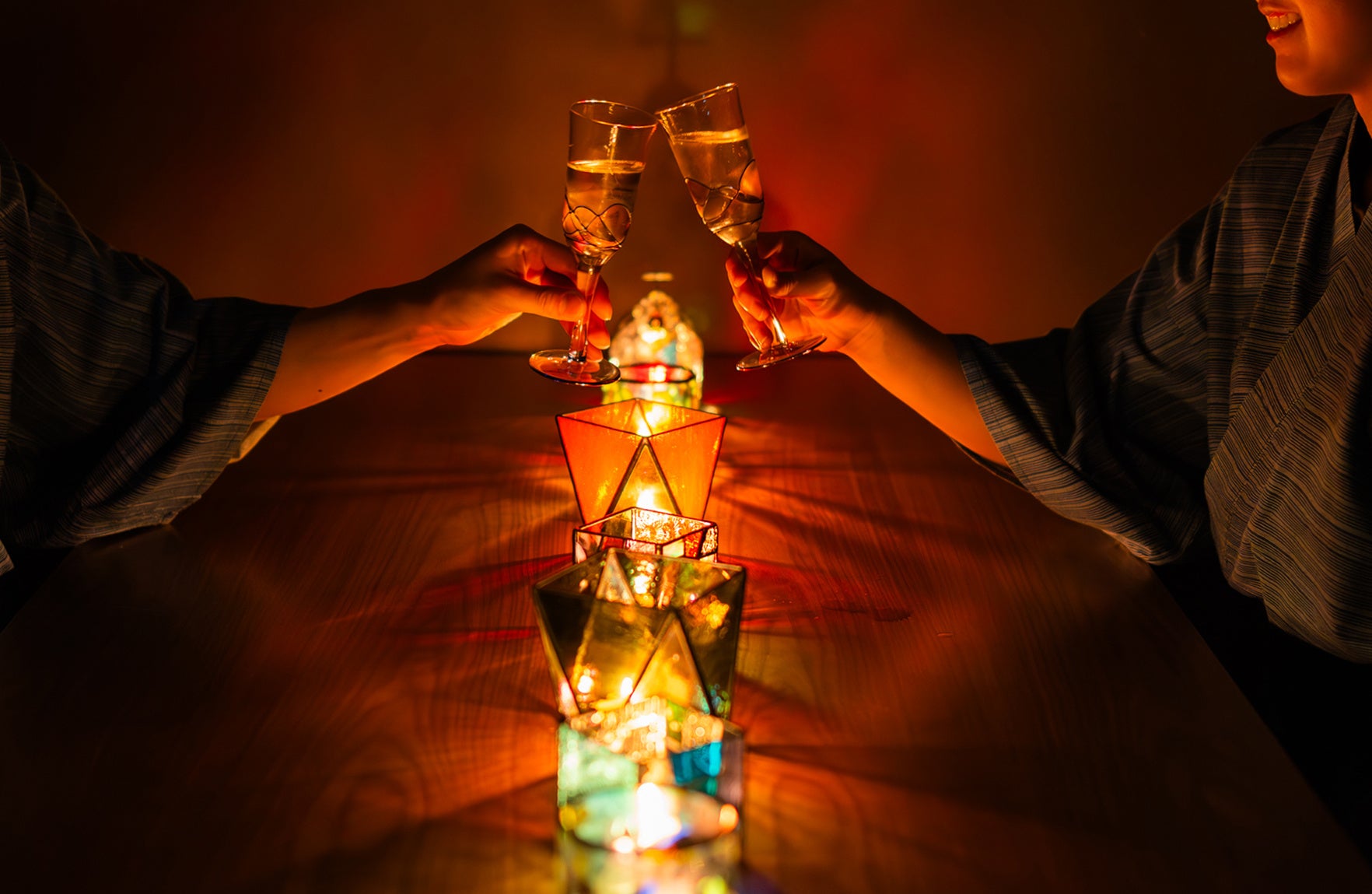 陽が沈み、あたりが暗くなってきた頃、客室にある露天風呂にステンドグラスのキャンドルホルダーを設えます。キャンドルに明かりを灯すことで、色とりどりの光が湯面に映りこみ美しく輝きます。昼とは違ったロマンティックな雰囲気を演出することで、客室付き露天風呂での滞在をより一層楽しむことができます。