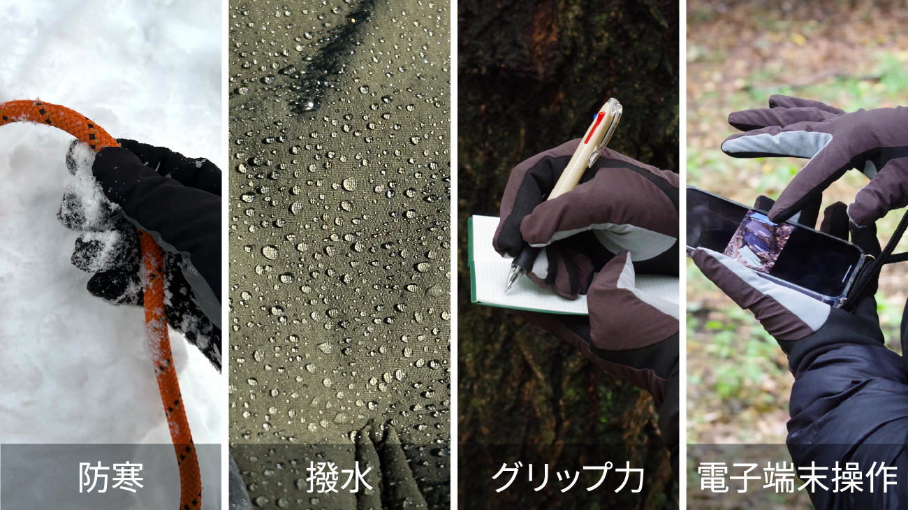 地域環境計画は1年を通して様々な地域で自然環境調査を行い、北海道や冬山での厳寒の野外作業にも頻繁に出ていきます。防寒や雨・風・雪への対策だけでなく、調査の記録を取るためのペンや鉛筆などの道具をしっかりグリップできるグローブを求めていました。