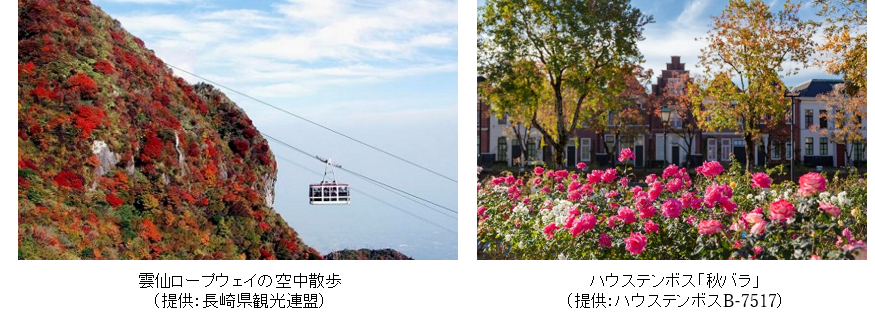 「当ツアーは、この時期にしか見られない紅葉と秋バラの絶景スポットをめぐる貴重なツアーです!九州の人気紅葉スポット「御船山楽園」や「祐徳稲荷神社」をはじめ、1000品種のバラが咲き誇るハウステンボスの「秋バラ」と夜の美しいイルミネーション「光の王国」を一度にお楽しみいただけます。佐賀を代表する名園「御船山楽園」の約15万坪に広がる秋景色は圧巻です。また紅葉する植物が120種類以上あると言われる雲仙の「仁多峠」では、ロープウェイで紅葉の中を空中散歩!混雑の少ない朝一番にご案内いたします。紅葉はもちろん、ハウステンボスの絶景とアトラクションを楽しめる本ツアーはご夫婦からファミリーまであらゆるお客様におすすめです。」(クラブツーリズム九州担当) |