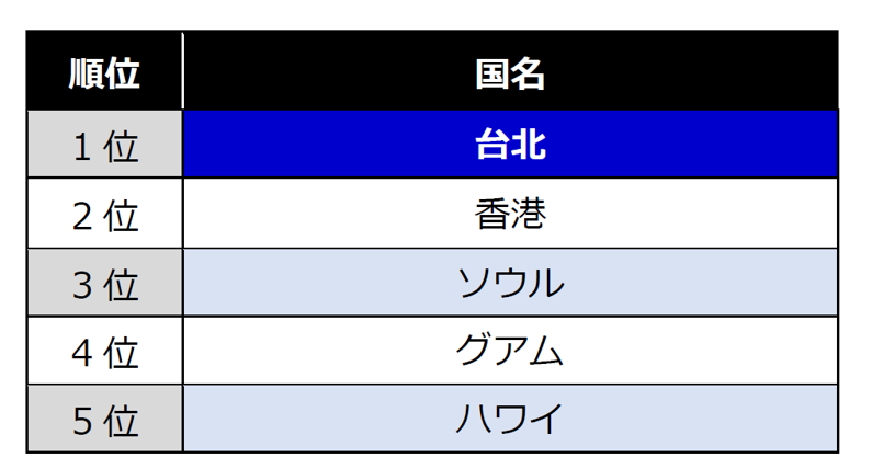 今年以降、徐々に回復傾向にある海外旅行ですが、物価高・円安の影響を受け、人気旅行先は引き続き安・近・短のアジア圏に集中しています。1位は「台北」。ゴールデンウィークの海外人気旅行先ランキング(2023年4月28日発~2023年5月8日着の海外旅行予約人数)ではランク外であった「台北」が急浮上しています。台北線は多くの路線で本格再開したことをはじめ、安くて近いだけでなく、親日国である安心感から久しぶりの海外として行きやすいため、幅広い世代から人気となっています。そして2位が「香港」。「香港」もゴールデンウィークのランキングでは8位でしたが、2位に大きくランクアップ。11月に注目の観光スポットがオープン予定となっており、これまで政情不安で旅行者が減っていた香港の人気が復活し始めています。そして第3位が「ソウル」。コロナ禍以降の韓国ブームが牽引し、20・30代の若年層からの予約も多く見られました。