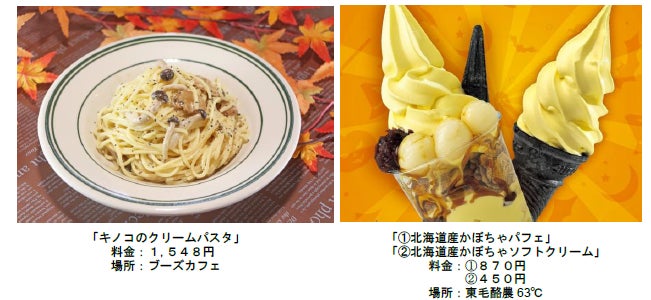 秋の味覚のひとつである、キノコをたっぷりと使用した「キノコのクリームパスタ」や、カボチャの甘さとソフトクリームがマッチした「かぼちゃパフェ」など、メインのお食事からスイーツまで取り揃えます。