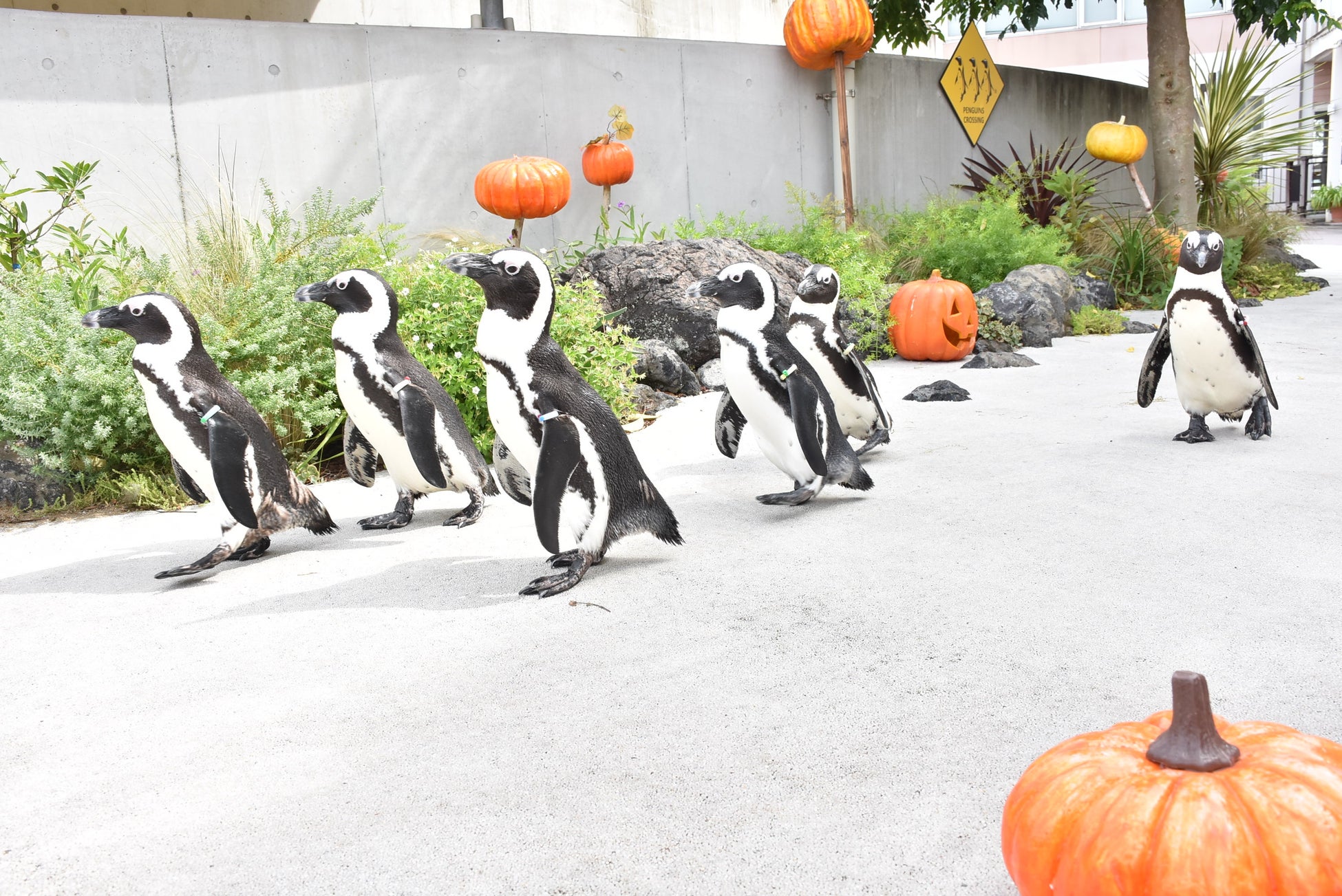 「ふれあいラグーン」では、秋風が心地よい季節に、ぺたぺたよちよちと歩く姿が可愛らしいケープペンギンたちが「ジャック・オー・ランタン」などに彩られた道をパレードいたします。ぺたぺたと二足歩行で歩き回る可愛らしいペンギンたちの姿は必見です。