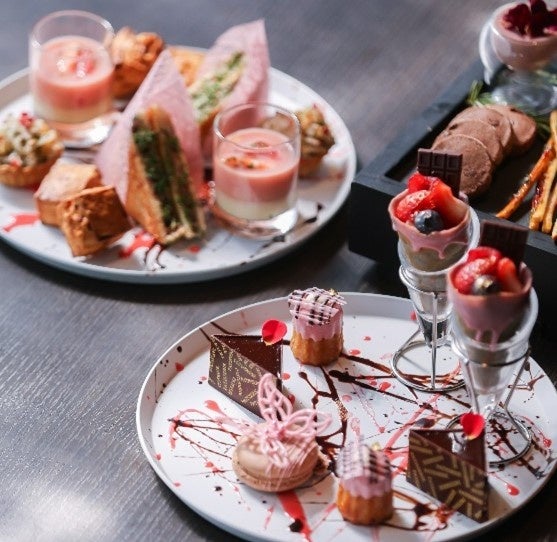 “DIP=つけて食べる”をコンセプトに、“パステルピンク×ショコラブラウン”をテーマカラーにした「Chocolate Afternoon Tea ~THE DIP~」。深みあるローズの香りを纏うスモークとともに登場するDIPプレートは、酸味や苦味などの味覚を刺激する4種のチョコレートソースを苺やクッキーに絡めていただく、“特別な体験”をご提案いたします。メインスタンドは、和モダンをテーマにしたカヌレやスコーン、スペシャリテの「ベリーショコラクレープ」など味も見た目も多彩なスイーツ5種と、フレンチをベースにしたホットサンドやキッシュなど、こだわり
