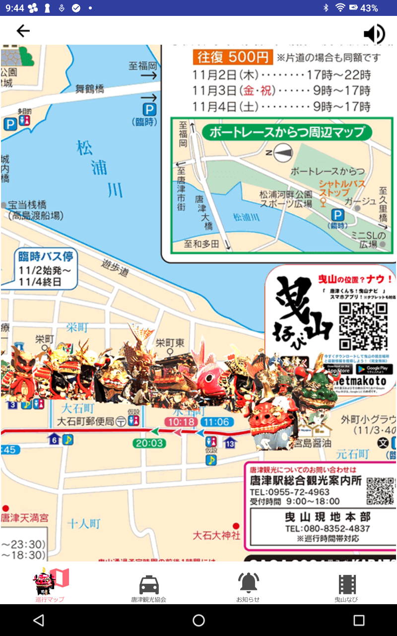 「曳山なび」は、このほかにもスマートホン向けのアプリも無料公開しており、臨場感のある文字通りナビゲーションを唐津くんち当日は行っています