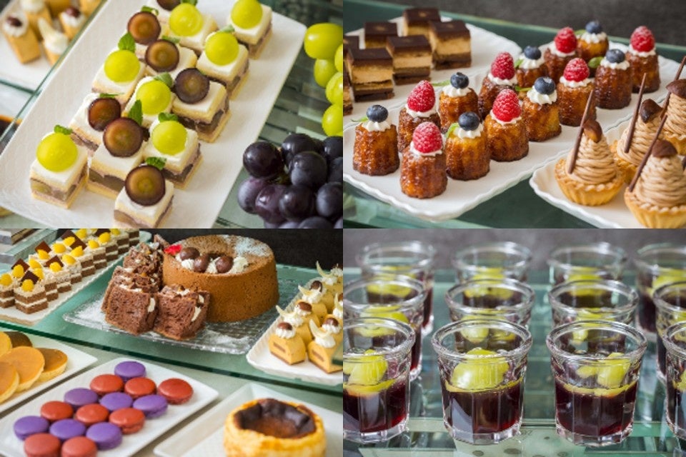 <スイーツ>パンケーキ(ライブキッチン)、ぶどうのジュレ、マロンパンナコッタ、タルトモンブラン、チョコレートシフォン、バスクチーズケーキ、ぶどうショートケーキ、マカロン 各種、カヌレ、モンブランショートケーキ、キャラメルマロン、オペラ、クッキー 各種