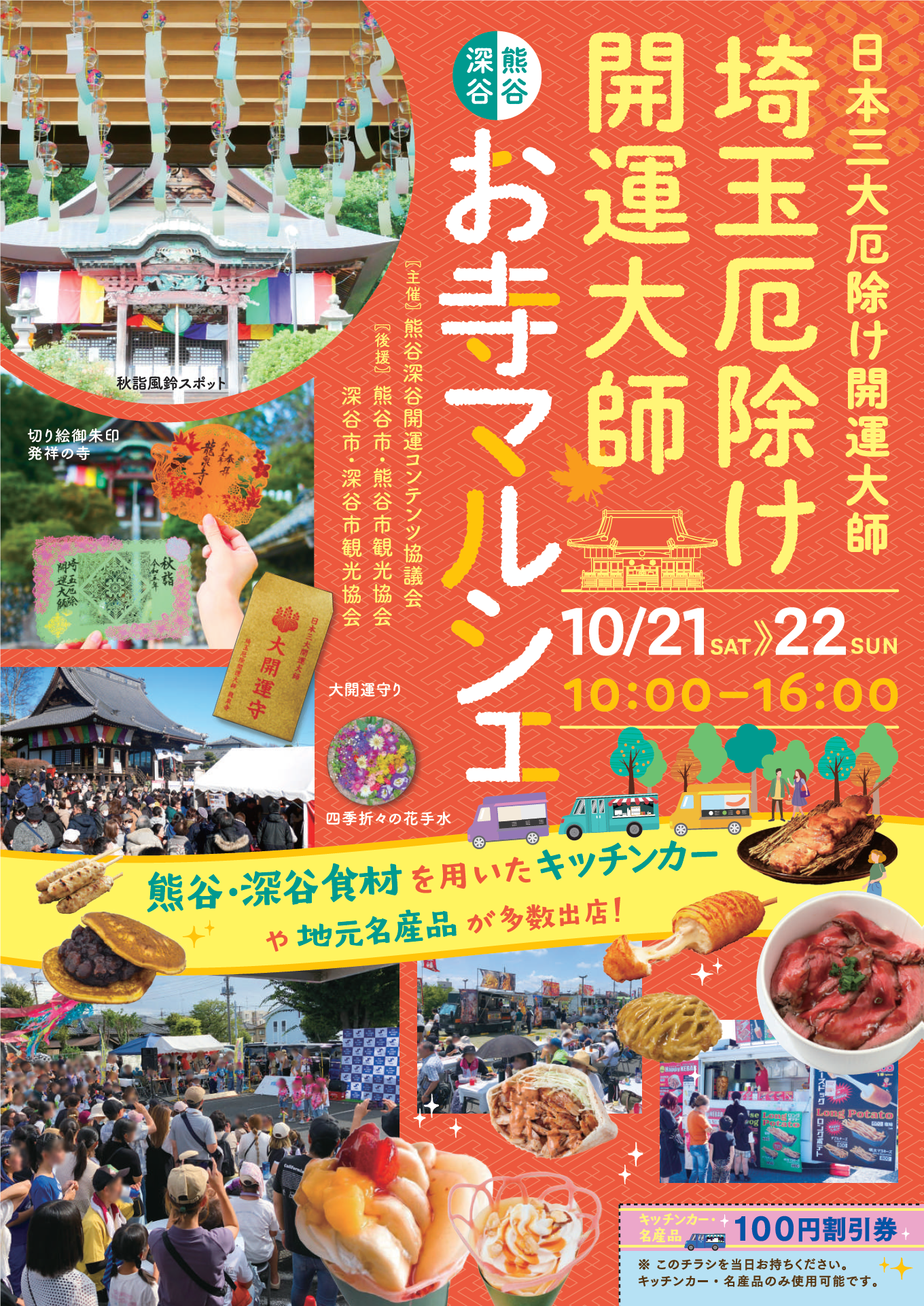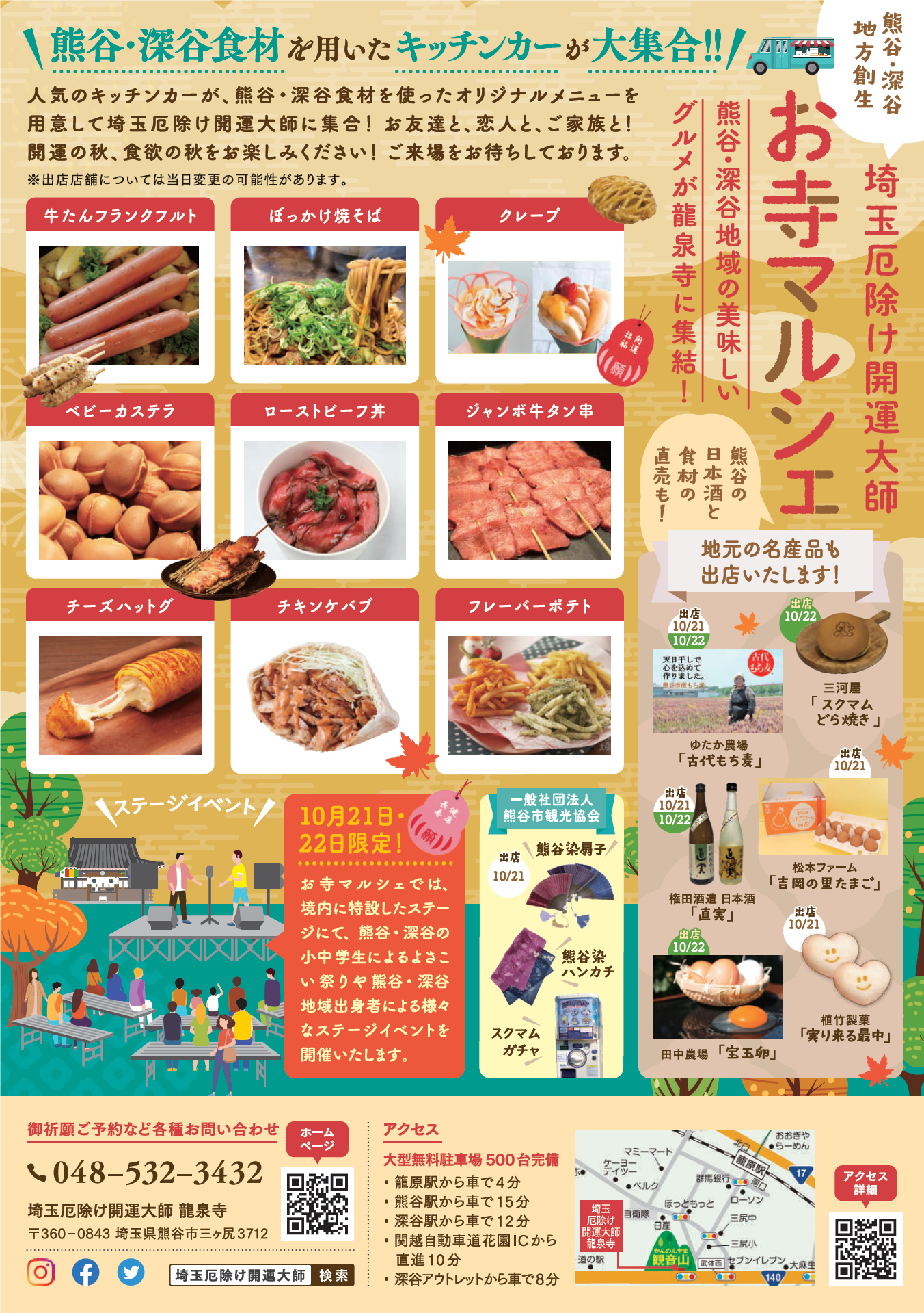 2日間を通じて、地域で大人気のキッチンカーが熊谷・深谷の食材を使ったオリジナルメニューを用意して登場します。また、地元の名産品ブースも多数出店し、食べて・見て・買って楽しいマルシェです。また、今年から境内に特設ステージが設置され、熊谷・深谷の小中学生によるよさこい祭りや地域出身者による様々なステージイベントが開催されます。熊谷市・深谷市の食材や名産品を知ってもらうことや、地元への愛着を感じてもらうことで、地域活性化や地産地消の取組を実現いたします。