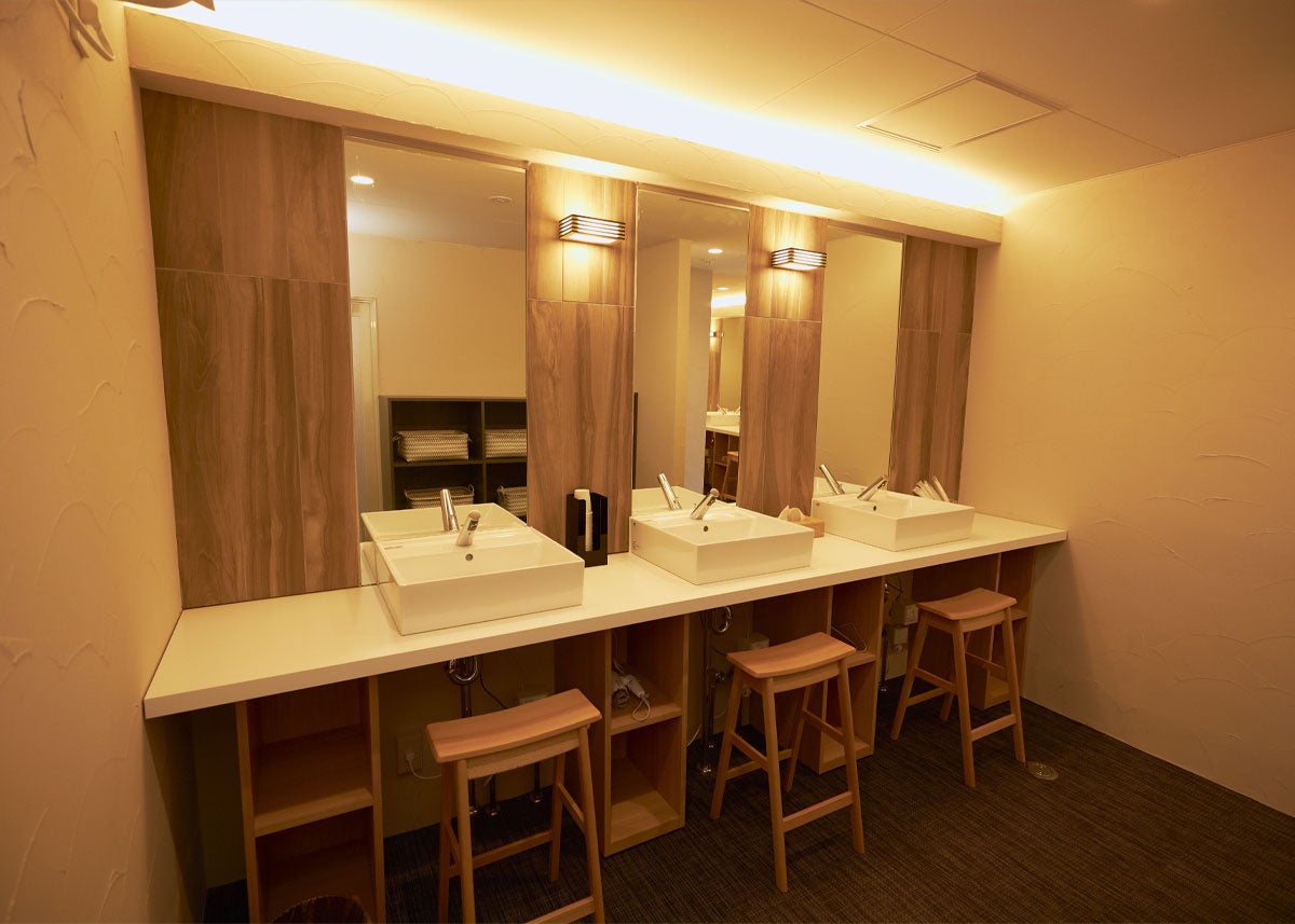 隣接する洗面室は、大人の方もくつろぎながらお支度をして頂けるよう、落ち着いた上質な空間となっております。宿泊者はもちろんのこと日帰りでも利用できるので、ドライブに行った際など気軽に立ち寄ってみてはいかがでしょうか。