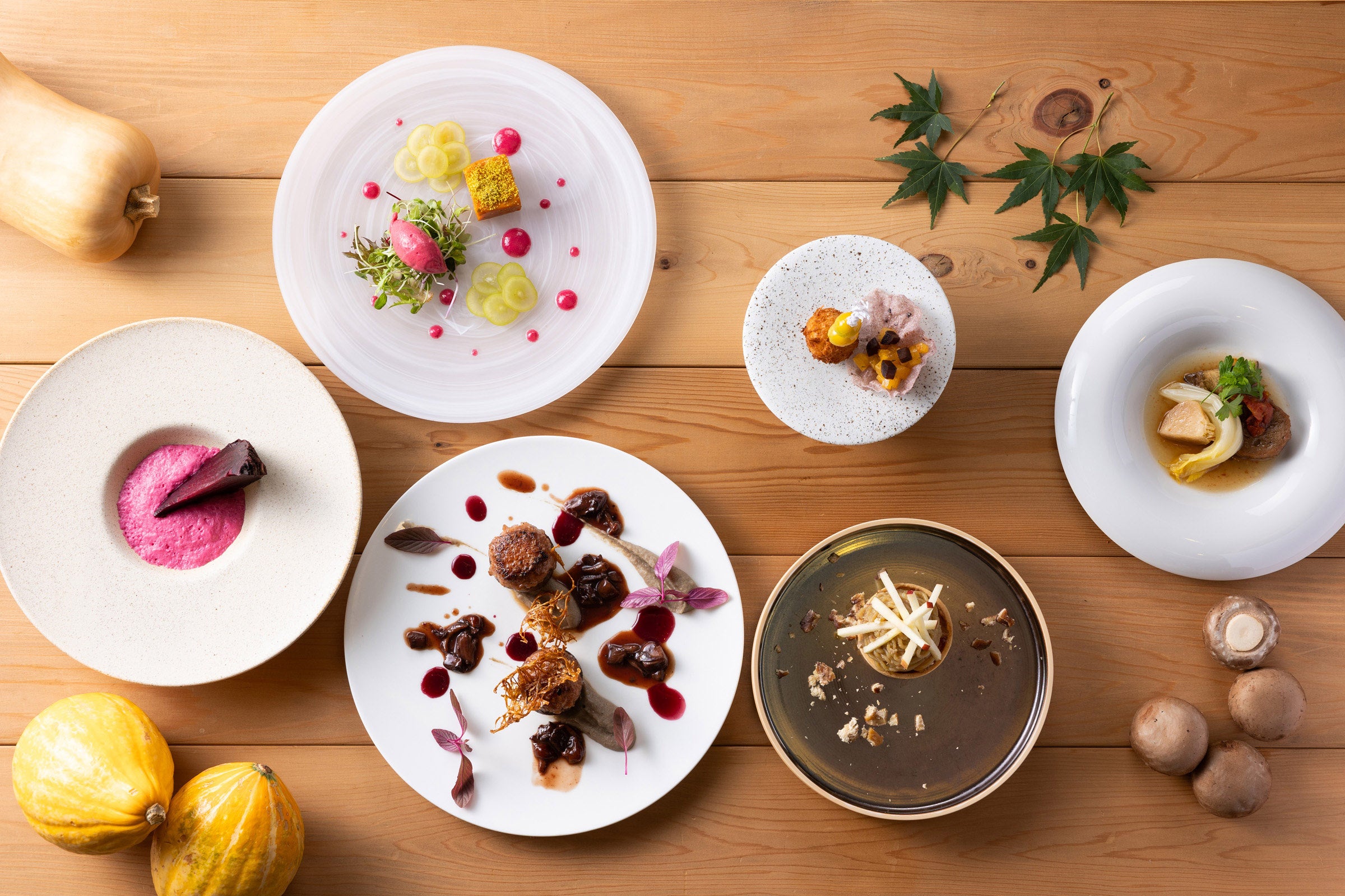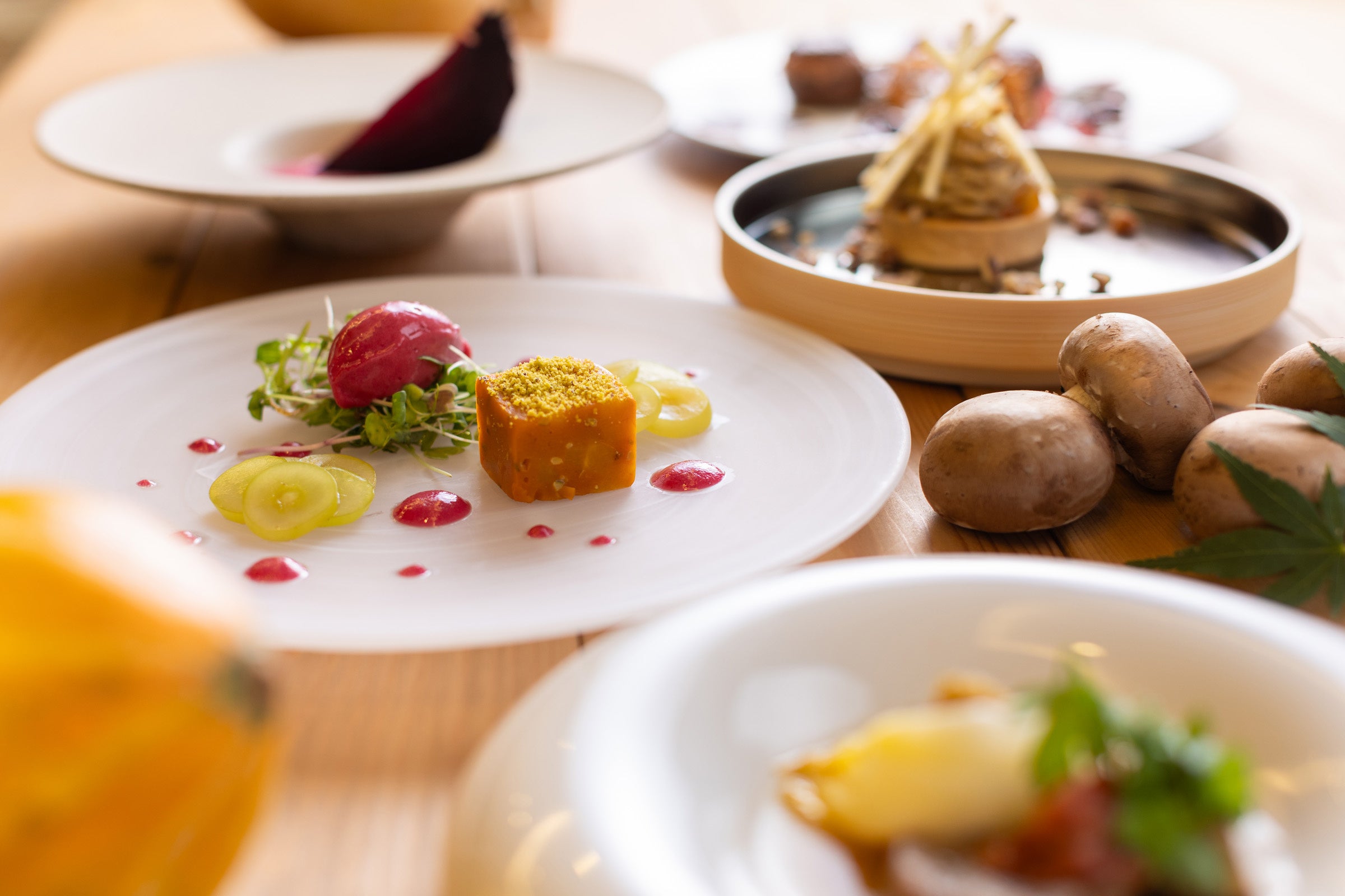前回5月に発売し、ご好評をいただいたヴィーガンランチが、装いも新たにディナータイムでもお召し上がりいただけるようになりました。秋に採れる野菜やフルーツをたっぷりと使用し、医師によるアドバイスのもと、季節感とともに豊富な栄養素を取り入れていただけるコースです。前菜は、濃厚な味わいの「南部一郎かぼちゃ」をテリーヌ状にして、表面に砕いたピスタチオをまぶした一品。梅干しとルバーブを合わせたさわやかなソルベとシャインマスカットが、かぼちゃの甘味を引き立てます。スープは、2種類をご用意。透き通ったきのこ出汁で野菜を煮込んだスープには、旨みが染み込んだ仙台麩を合わせて。色鮮やかなボルシチ風のポタージュは、オーツミルクでクリーミーに仕上げ、じっくりと火を入れ甘みを引き出したビーツのローストを添えました。お好みに合わせて、2種類のスープを混ぜ合わせてお召し上がりいただくことで、味わい深い秋の逸品に。メインは、肉厚なジャンボマッシュルームに、香り豊かなトリュフと大豆ミートを詰めて香ばしく焼き上げ、ほどよい酸味の山ぶどうのソースが寄り添います。デザートは、キャラメリゼした香ばしいりんごの上になめらかな和栗のピューレを絞りモンブラン状に。添えられた、ヴィーガンチョコレートのソルベとともにお楽しみいただけます。