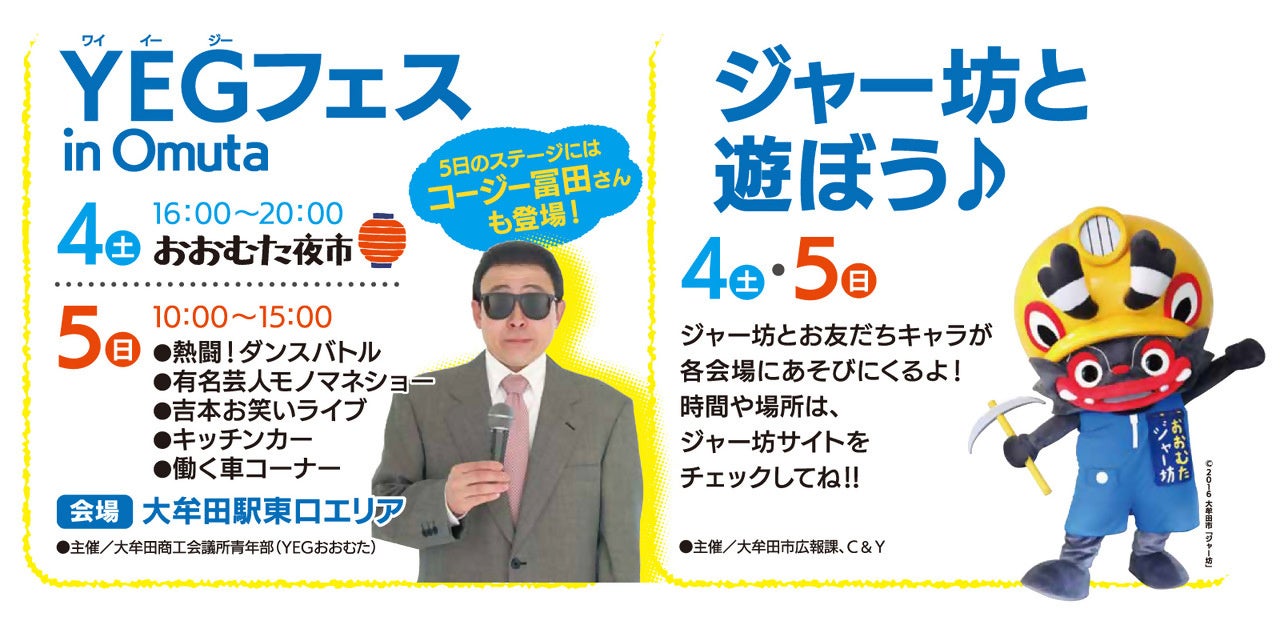 おおむた夜市・有名芸人モノマネショー(コージー冨田さんも登場!)・吉本お笑いライブ・キッチンカー・働く車コーナー