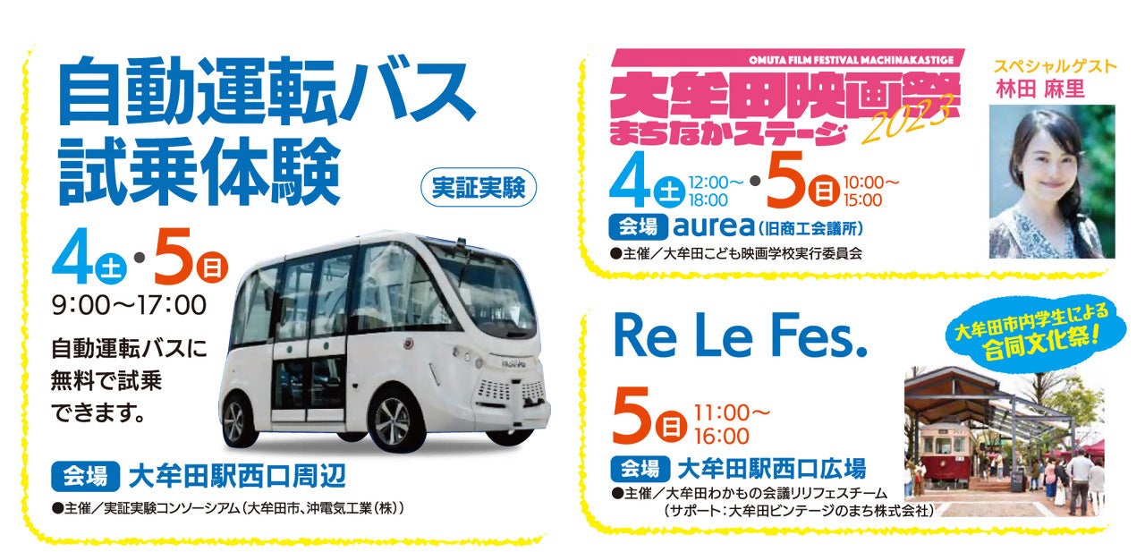 大牟田駅~新栄町駅間の「まちなか」エリアで、様々なイベントを同時開催します。ものまねショーあり、自動運転バス試乗体験あり、さらに映画祭やマルシェ、学生による文化祭も!