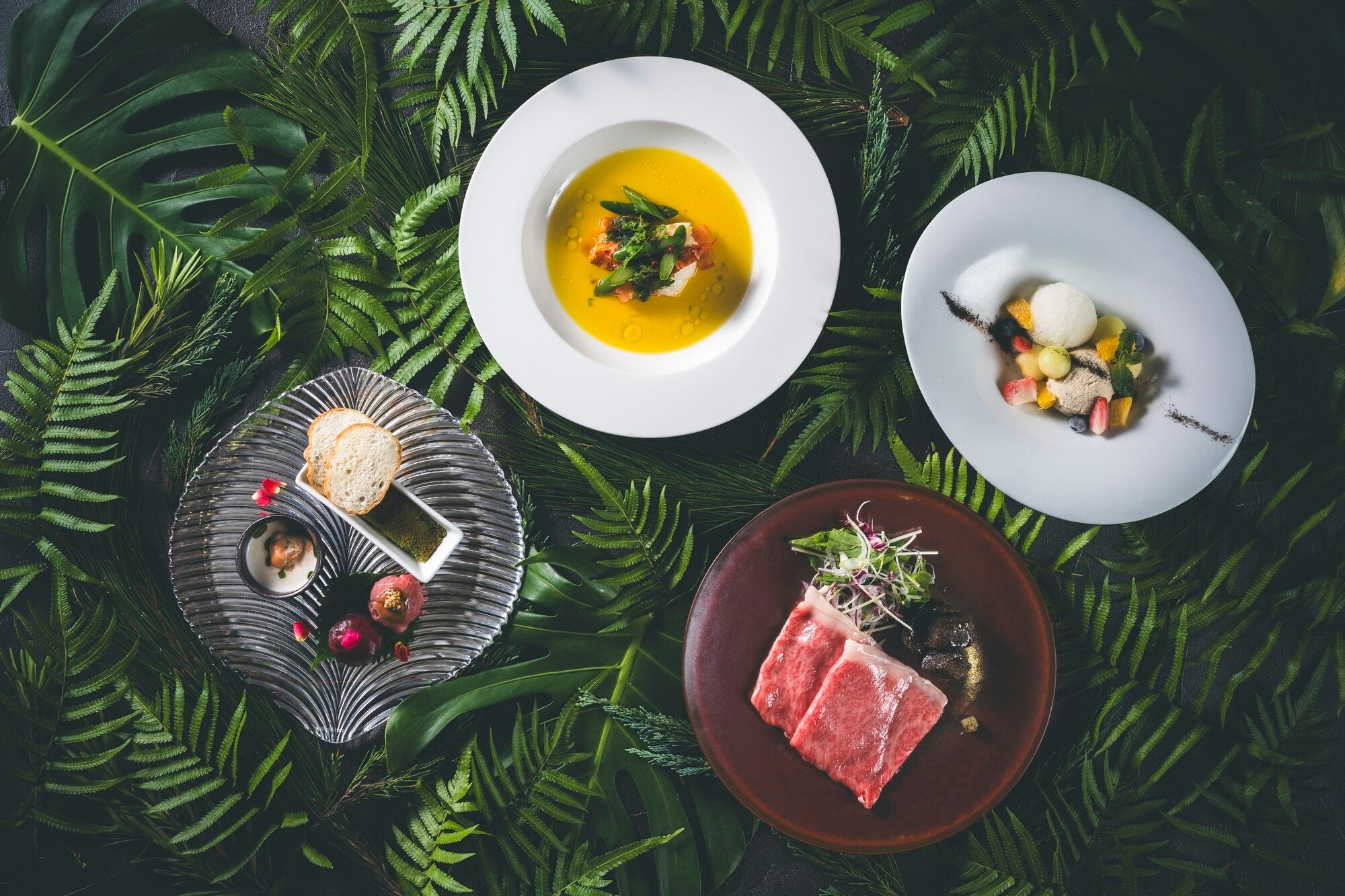 <コースメニュー例>山原恵みのオードブル取り合わせ、赤仁ミーバイとアーサのマース煮仕立て サフランの香り、本部牛サーロインのヒマラヤ岩塩炙り 金武町産田芋とオリエンタルハーブサラダ、他