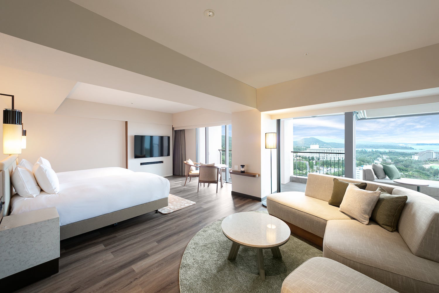 対象客室は、クラブオーシャン・プレミアム、クラブコーナー・プレミアム、クラブルームの3カテゴリーで、お部屋には花束とスパークリングワイン、カットフルーツをご用意しています。室内のベッドを華やかに演出する花びらやホールケーキのご注文など、記念日を彩る特別なオプションプランもご利用いただけます。緑豊かなやんばるの山々と東シナ海を一望できるお部屋でおくつろぎいただいた後は、レストラン「ブッフェ&グリル クワッチー」の特別なディナーコースへご案内。食後は、クラブルームの宿泊者だけが利用できるクラブラウンジにて、アルコールや軽食とともにリラックスタイムをお過ごしください。