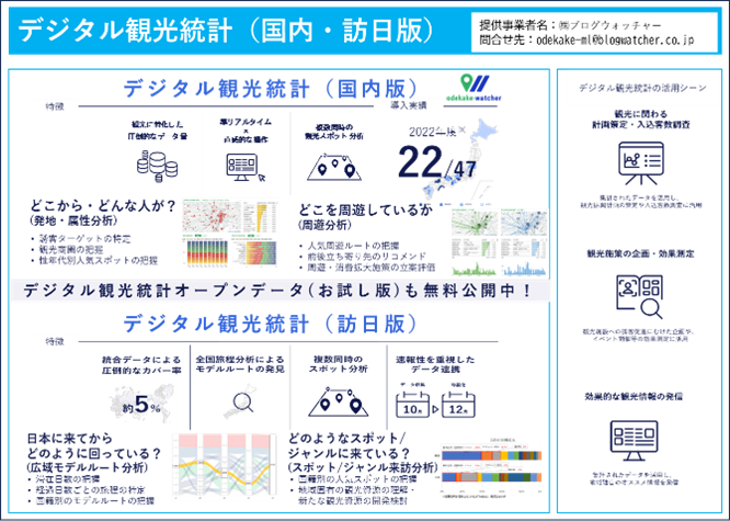 ② おでかけウォッチャー・デジタル観光統計(国内・訪日版)株式会社ブログウォッチャー※27日、活用セミナーでご紹介 本リリース別頁にて詳細情報を記載しておりますので、併せてご参照ください。