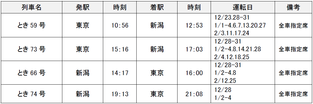 ※臨時列車以外にも定期列車「たにがわ」の高崎・越後湯沢~ガーラ湯沢駅間延長運転も行います。