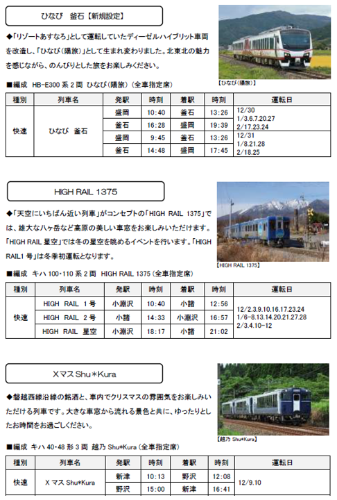 飯山駅周辺のスキー場やご旅行のお客さまへの利便性を図るため、下記の列車を飯山駅に臨時停車します。