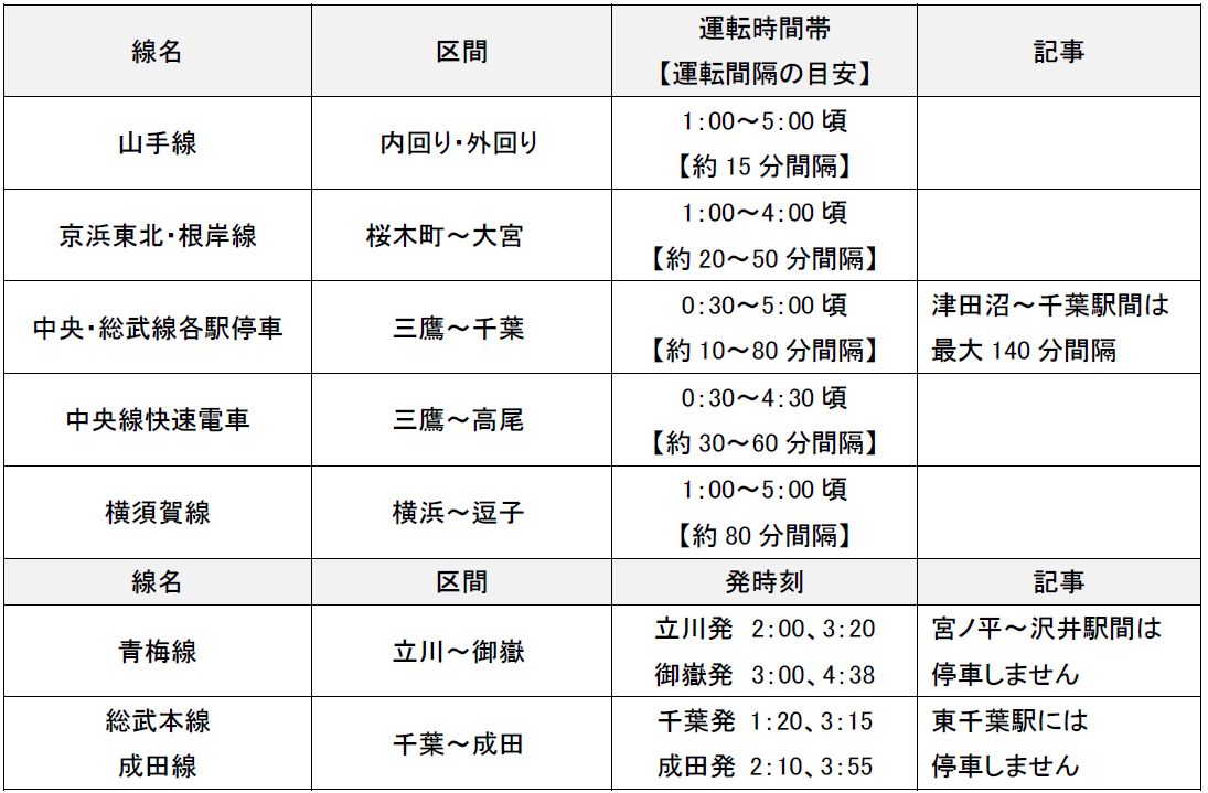 ※終夜運転については、12月8日(金)以降、デジタルJR時刻表及びJR東日本アプリ等の経路検索に反映します。