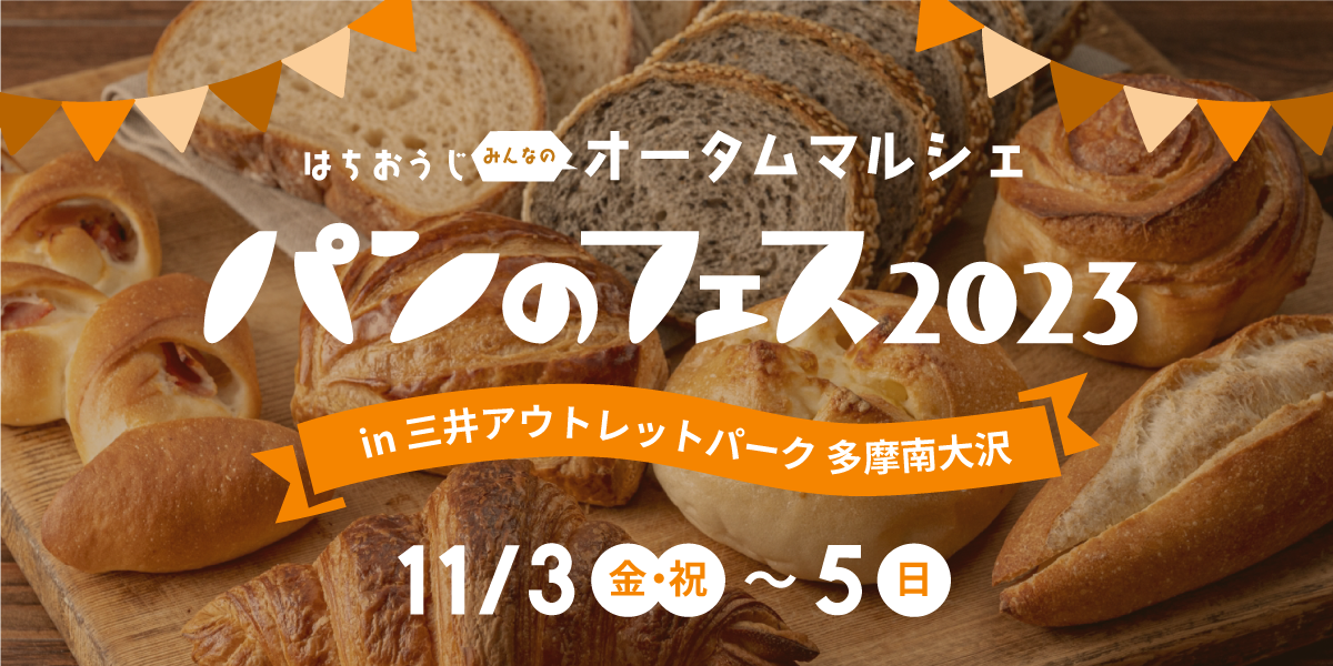 昨年大盛況だった『パンのフェス』が更にパワーアップして、2023年11⽉3⽇(金・祝)〜5⽇(⽇)の3⽇間、三井アウトレットパーク多摩南⼤沢にて開催! 本イベントは今年も「はちおうじ みんなのオータムマルシェ」とコラボレートして開催します。