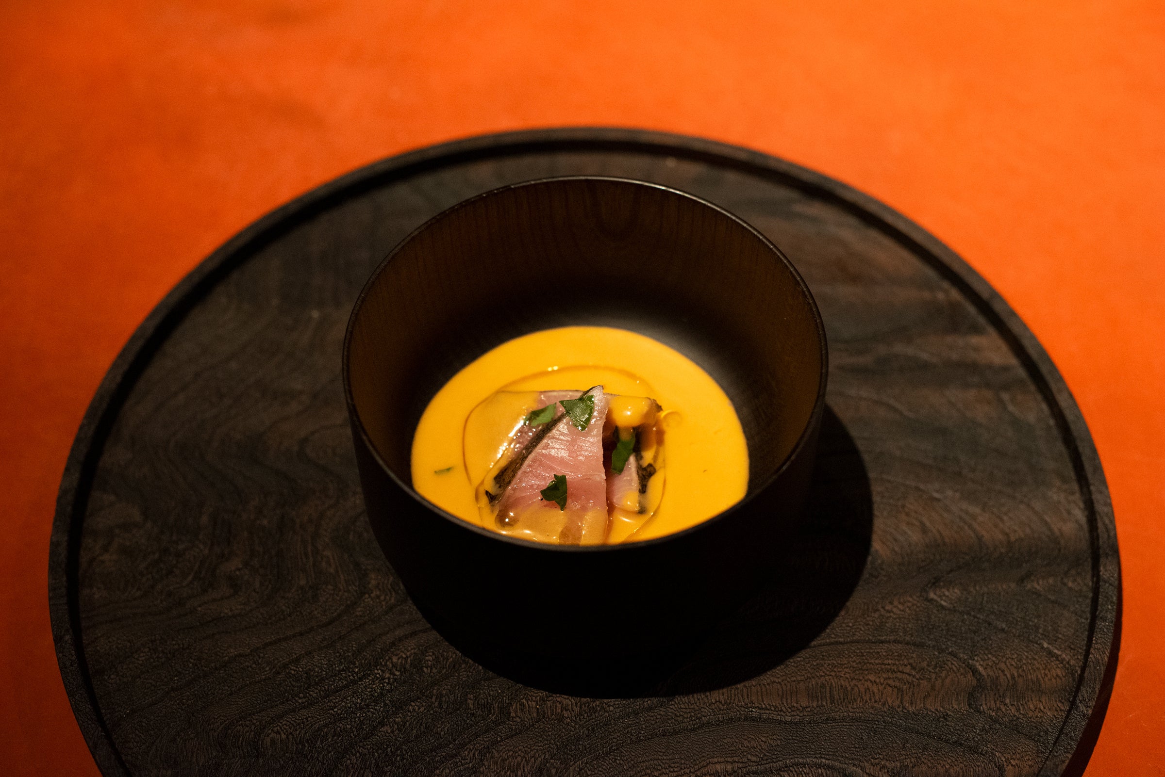 日本料理に使われる、柚子の果汁・醤油・酒・みりんをベースにしたタレに、鴨の胸肉を漬け込みながら炭火で焼いて幽庵焼に。柚子の柑橘の風味に、ヨーロッパの鴨料理には欠かせない本場のバレンシアオレンジを合わせることで全体の厚みある味がまとまっています。
