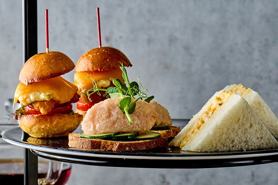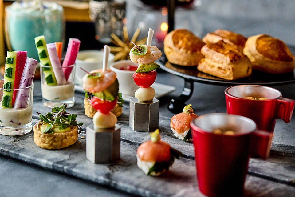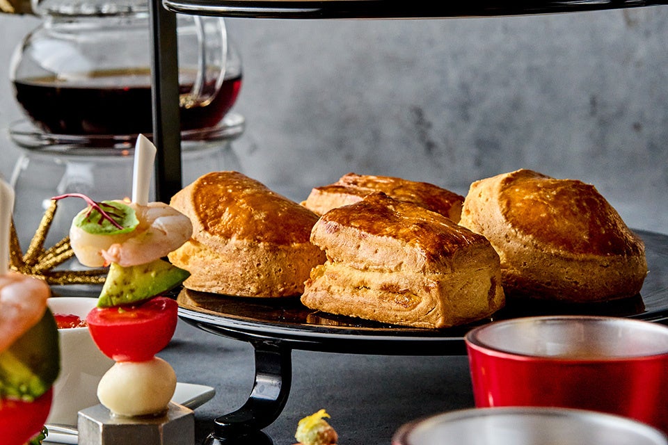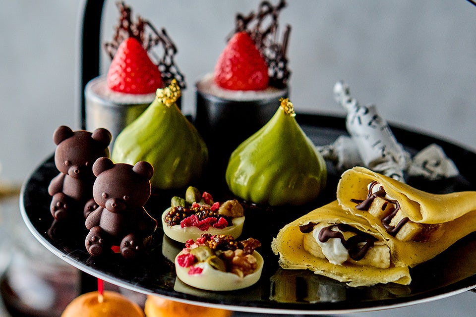 今回は、寒い冬にほっこりするような見た目にもキュートなアフタヌーンティーに仕上げました。プティフールでは、スパイスの香りとやわらかな苦みのバランスが絶妙なチョコレート「ニアンボ」を、くまさん型に模った一品は、食べるのが勿体ないほど。また、香ばしいナッツの香りとまろやかな味わいのピスタチオムースは、中のフランボワーズゼリーの甘酸っぱさがマッチし、後を引く美味しさです。人気のスコーンでは、シーズンフレーバーとして、ゆずのスコーンをご用意。ゆずのほど良い苦みと、さっぱりとした風味が口いっぱいに広がります。セイボリーは、ほっとする優しい味わいのクリーミーなカリフラワースープや、サクッと揚げたフィッシュにとろりとチーズをのせたバーガーは小さいながらもボリューム満点。この他にも、〆までとっておきたくなるようなスモークサーモンの手まり寿司などが並びます。ウェルカムドリンクでは、どこか寂し気な冬に垣間見える青空の色をイメージしたウェルカムドリンク「うすあさぎ」でお客さまをお出迎え。柔らかな温かさと優しい甘みが寒さで芯まで冷え切った身体をじんわりと温めます。