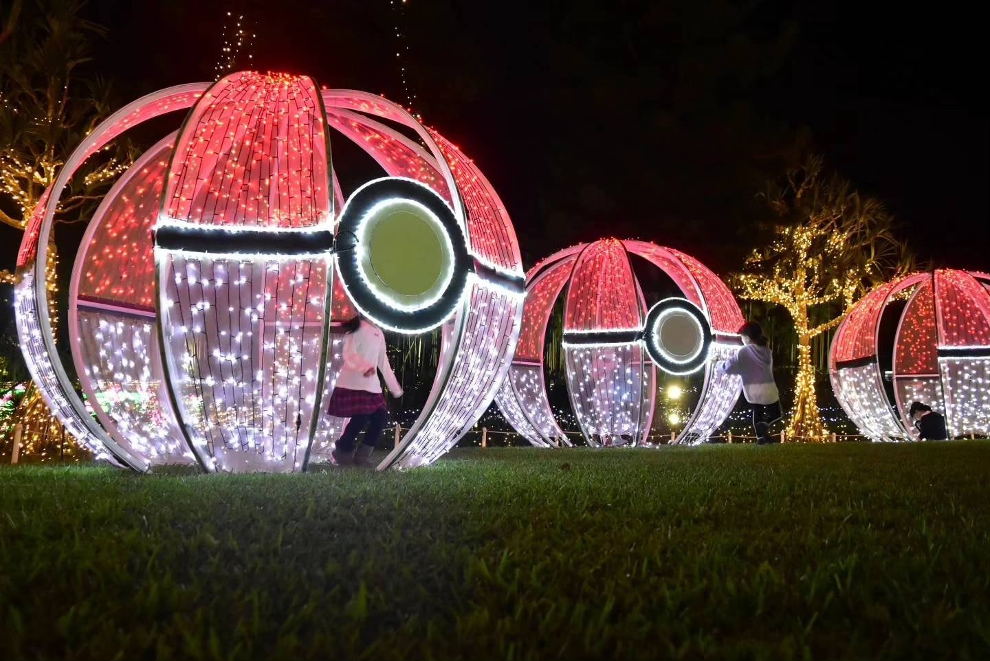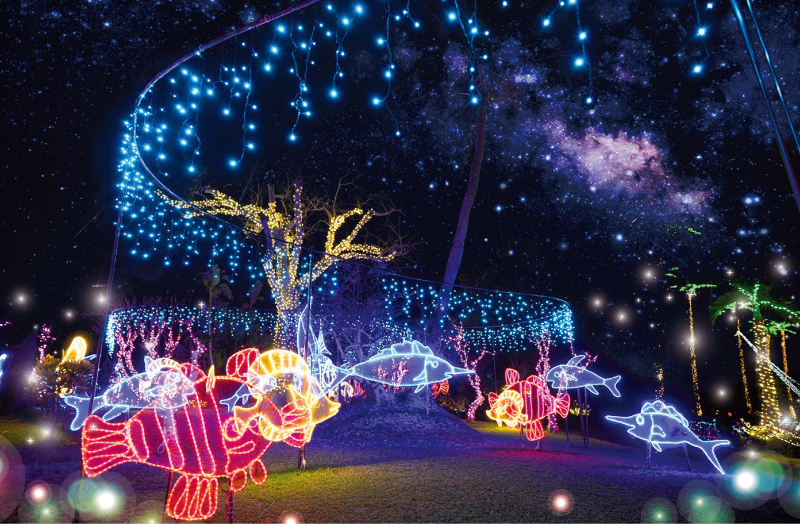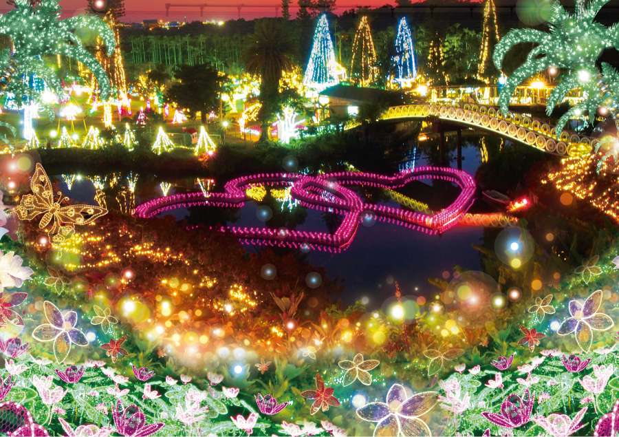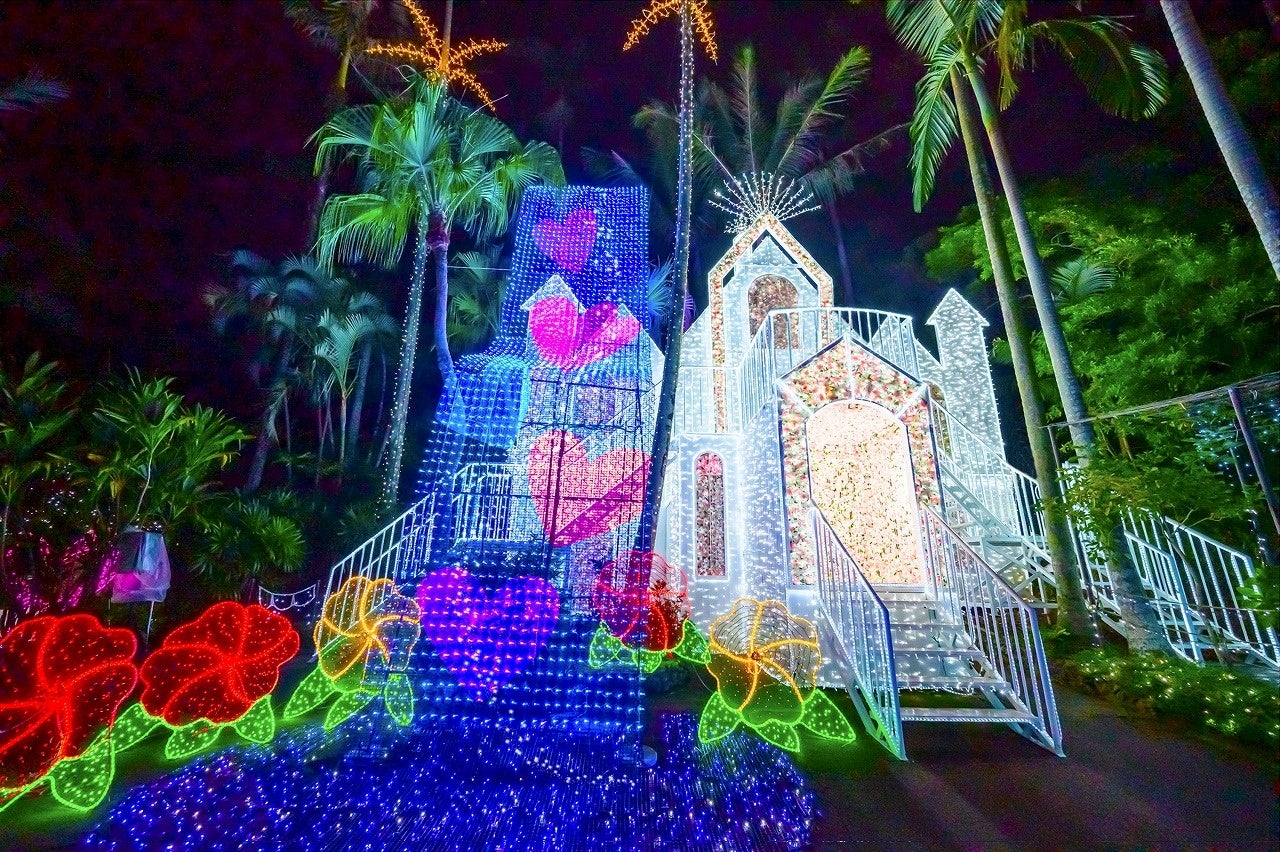 今年は約400万球で「輝く南国の花」をテーマに、壮大な蓮の花のイルミネーションやヤシの木のライトアップ、ハイビスカス、ヒスイカズラなど植物園ならではのモチーフが園内を彩り、他では味わえない興奮と幻想的な光で沖縄らしさが溢れるイルミネーションの世界を演出いたします。