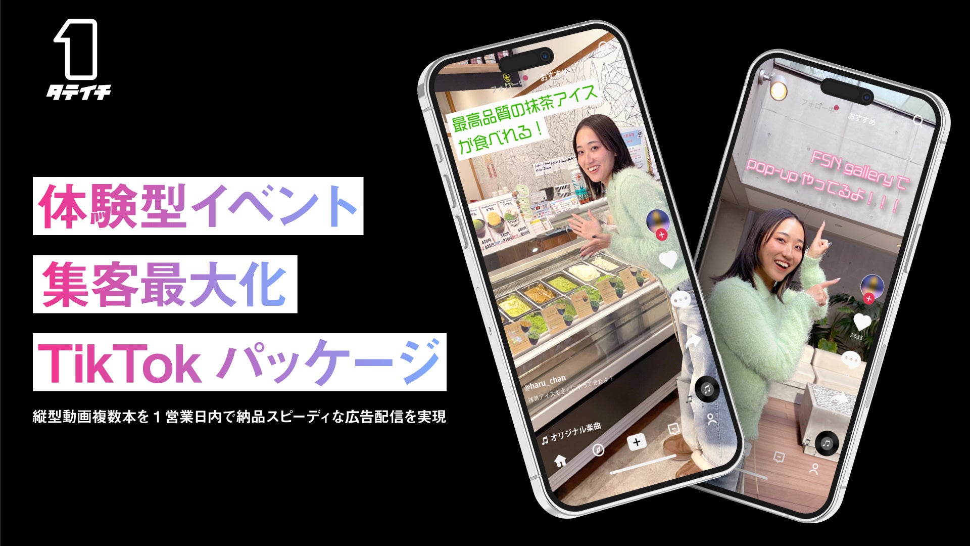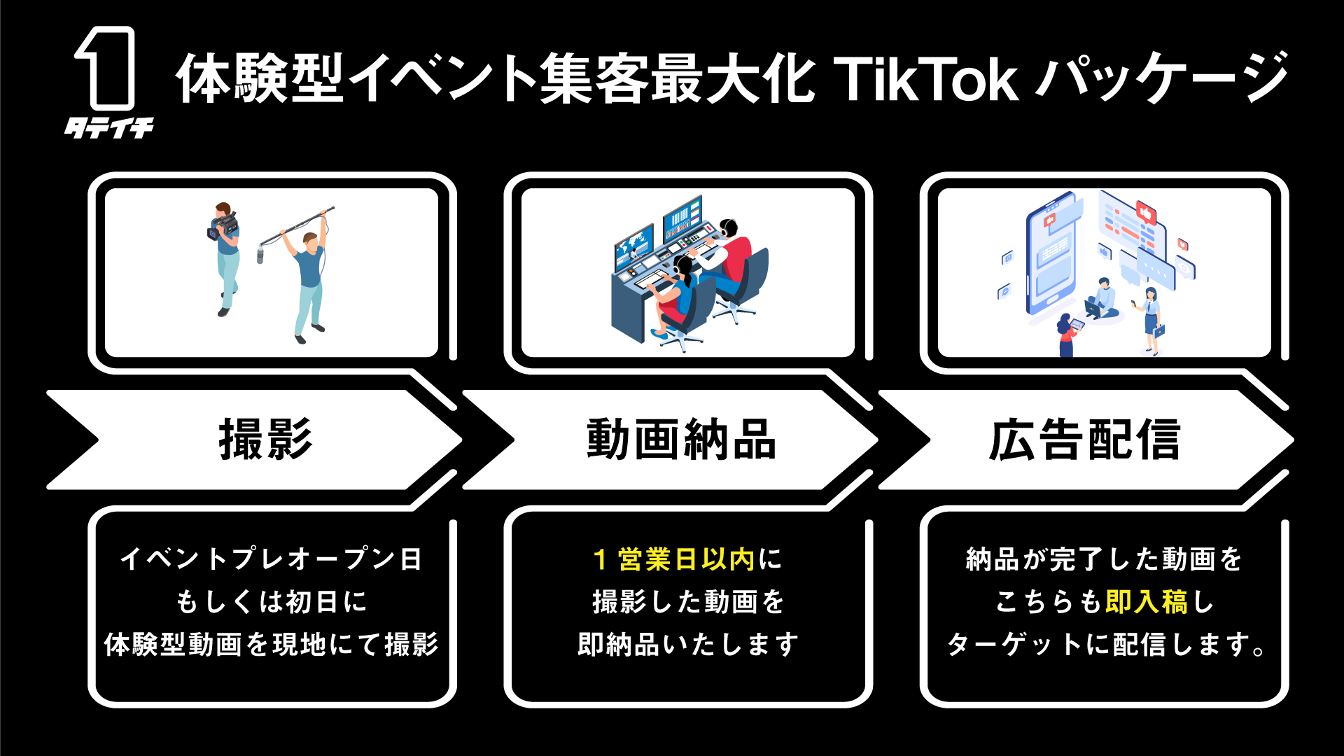 「体験型イベント集客最大化TikTokパッケージ」では、複数本のクリエイティブ制作と、最適な広告配信設計を掛け合わせ、集客最大化、またはイベント動画クリエイティブを通じたブランドリフトの最大化を実現いたします。