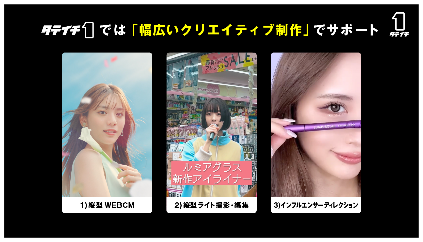 これらの3つの要素を兼ね備えた縦型動画コンサルティングスタジオ「タテイチ」では、縦型WEBCM、縦型ライト撮影・編集、また、 1,500名を突破した提携TikTokerの最適なキャスティング及びディレクションによって、パートナー企業の幅広いクリエイティブ制作をサポートして参ります。