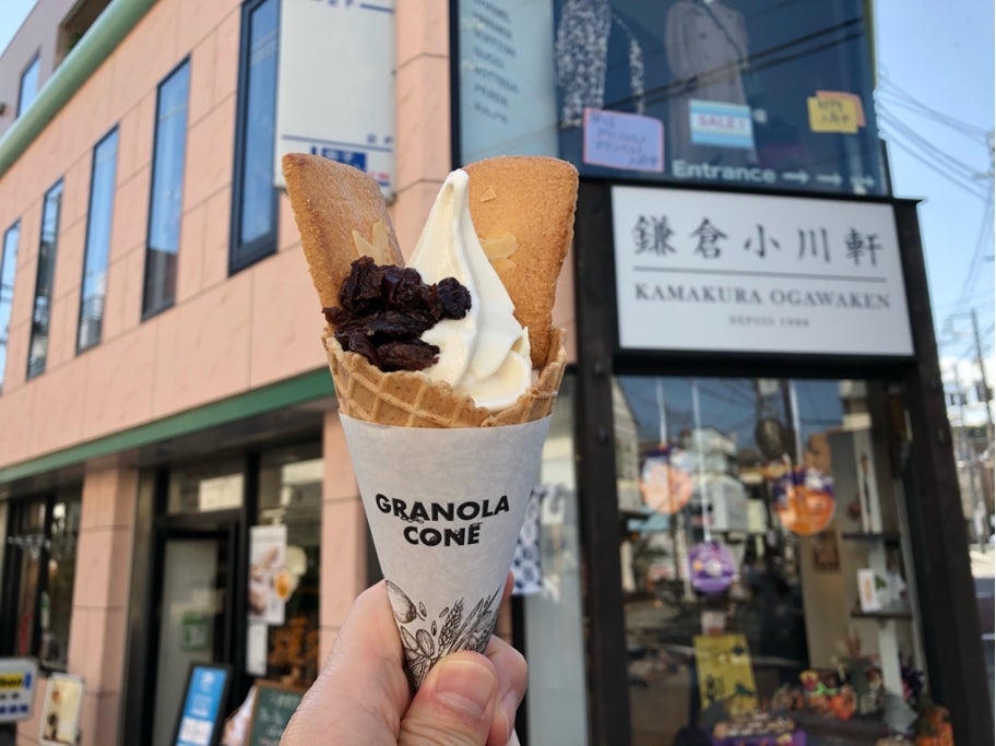 「サクッとしたバターサブレ」「ふっくらと香り高いラムレーズン」「口溶けなめらかなバタークリーム」の三重奏が楽しめる「レーズンウィッチ」が大人気の鎌倉小川軒。小さい頃から食べていた大好きなお菓子がソフトクリームになった「鎌倉小川軒ラムレーズンソフト」は、ラムレーズンのソフトクリームがベース。ふっくり煮上げたレーズンと、サックサクのバターサブレがトッピングされています。まさに、レーズンウィッチそのままのソフトクリームです。