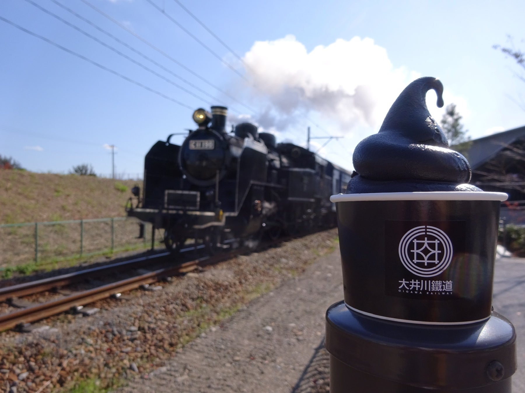 SLをイメージした漆黒のソフトクリーム、煙をイメージしたグレーのソフトクリーム、漆黒とグレーのコントラストが美しいミックスの3種類。