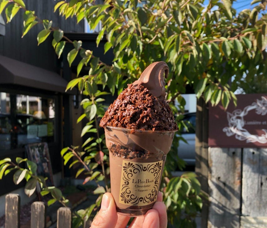 札幌市内の住宅街に隠れ家のように佇むお店『Lumiére et ombre(リュミエール エ オンブル)』。カカオ70%の超濃厚自家製チョコソフトに、チョコのフィヤンティーヌ(クレープ生地を薄く焼いたもの)がトッピングされています。ザックザクのフィヤンティーヌは、ソフトと相性抜群。ペロッと食べられる感動の一品です。