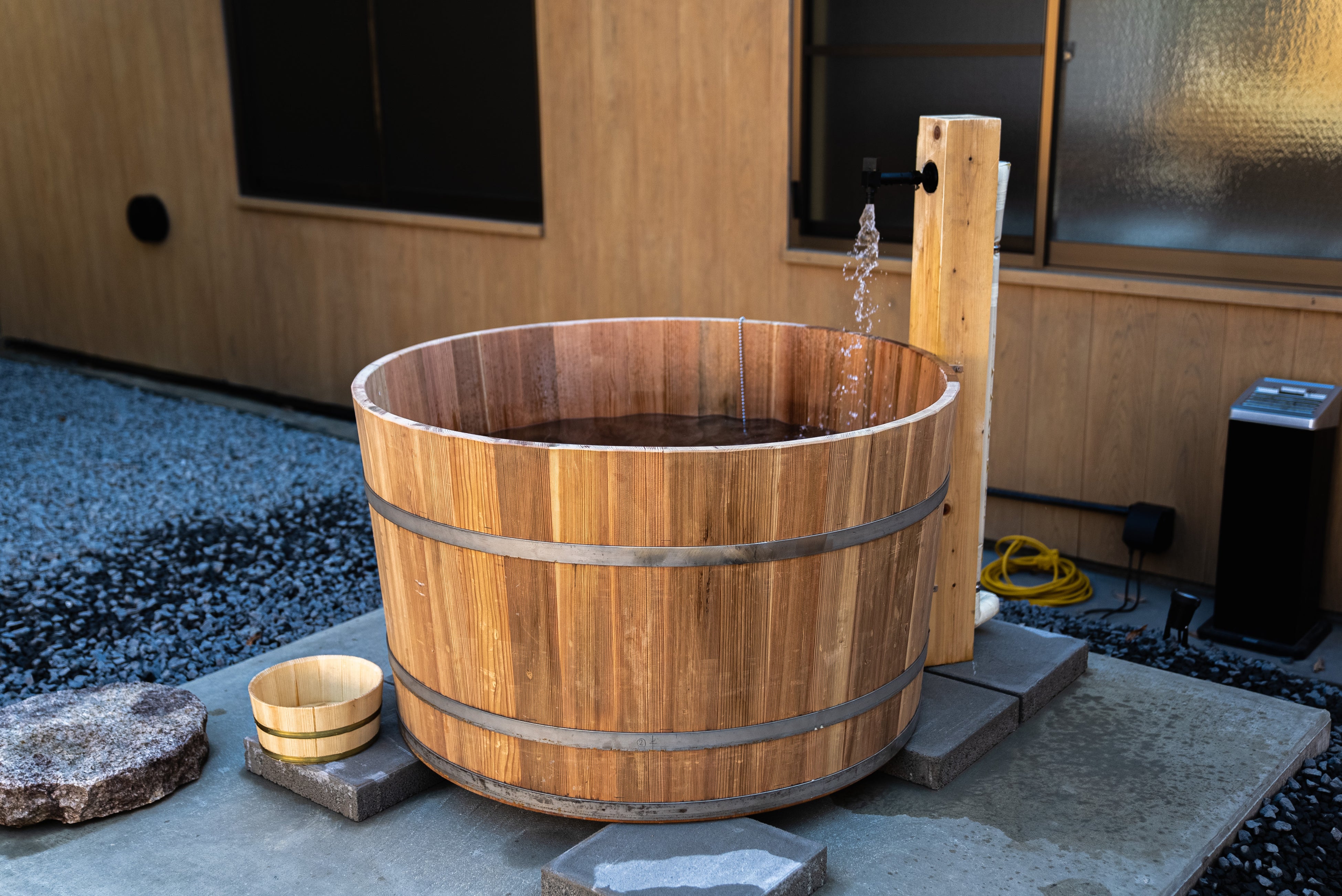 すでに温められている中に入る一般的なサウナと異なり、薪割りや火入れなど、お客様ご自身で一から作り上げるフィンランド式サウナです。1組限定の貸し切り宿なので、私語や寝転がることは禁止されておらず、自由に楽しむことができます。サウナのすぐ横に露天の水風呂があり、”サウナ⇋水風呂”のサイクルを何度でも堪能できます。水風呂の巨大な風呂桶は、和歌山県名匠にも表彰された、地元の桶職人・松本濱次さんが手がけました。