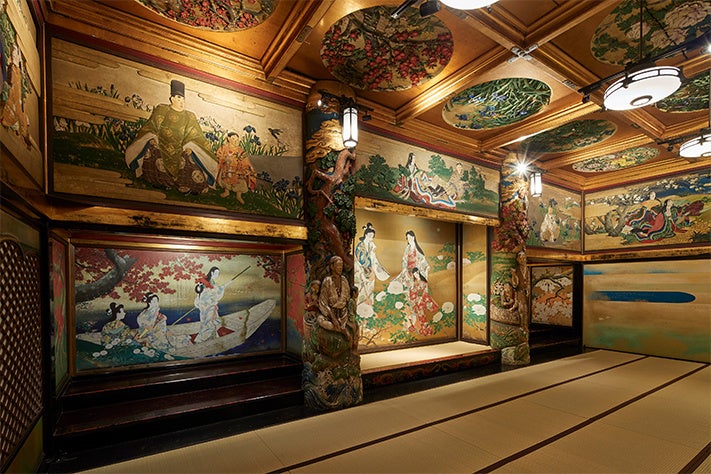展示会場である東京都指定有形文化財「百段階段」は、落成から90年を超えるレトロ建築で、かつては、料亭の宴会場として使われていました。ホテル雅叙園東京の前身・目黒雅叙園の昭和初期のパンフレットや、当時の新聞広告などの展示から歴史を辿ったり、会場の欄間や天井に施されたススキの草原や、作者の故郷の風景など、建造物に描かれたアートの景色をめぐり、時を超え美と戯れる愉しみ方もおすすめです。