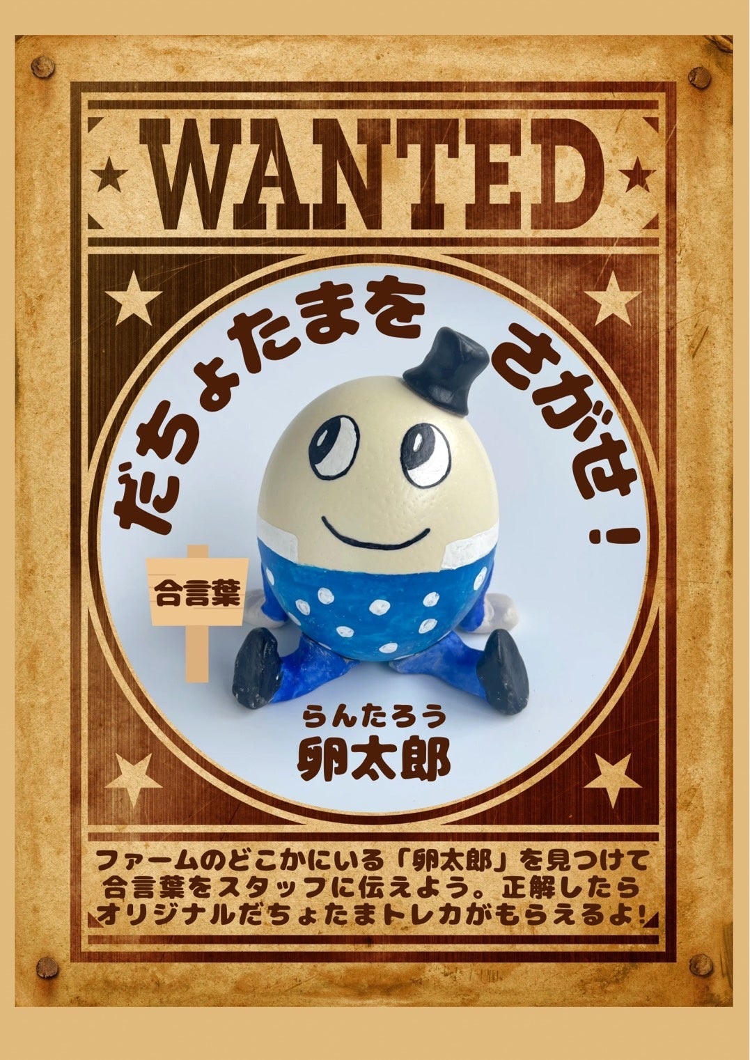 牧場のふれあいエリアには、ダチョウの妖精「だちょたまフレンズ」が隠れています。ショップで掲示されている手配書を参考に、「だちょたまフレンズ」を探し出しましょう。探し出した方には当牧場よりオリジナルトレーディングカードを差し上げます。