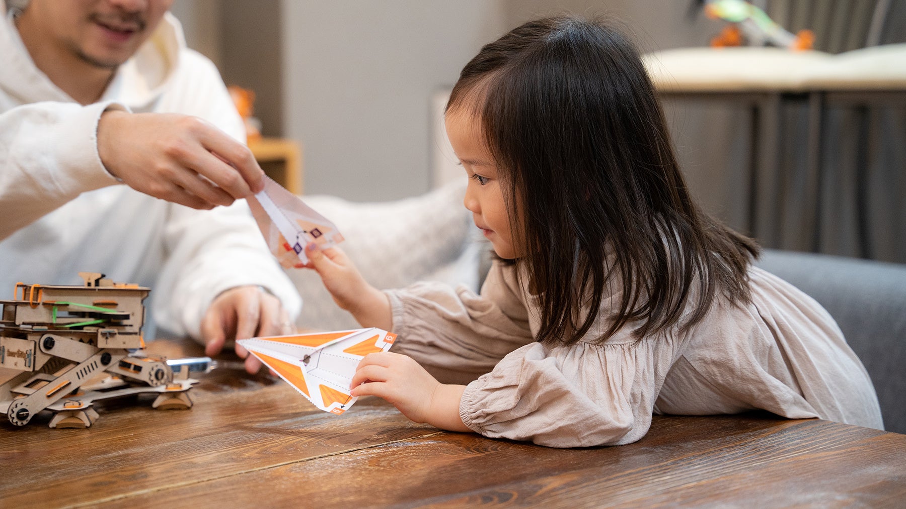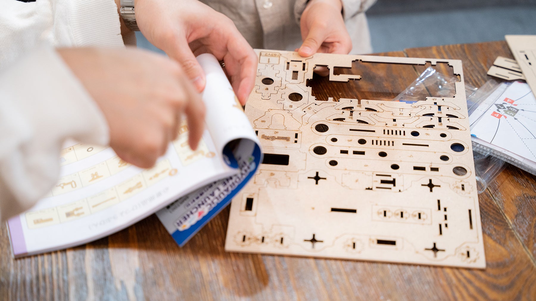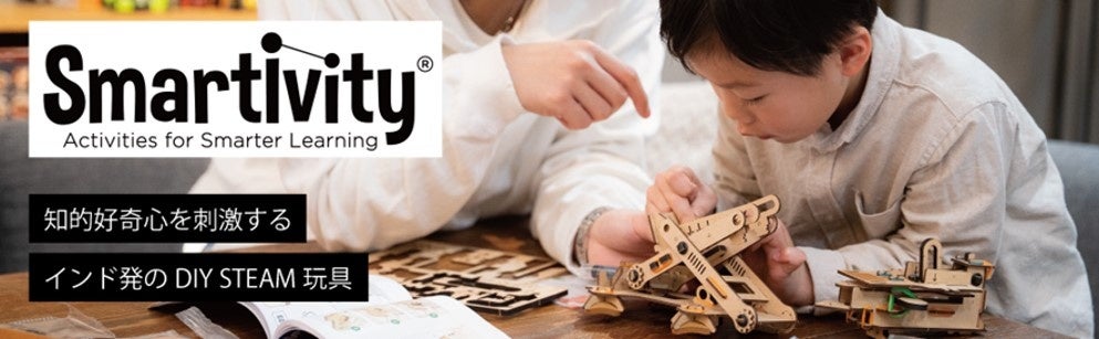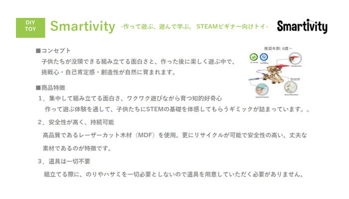 SmartivityはIT大国インドからやってきたSTEAMトイです。すでに33カ国で販売され、世界中の子ども達に喜ばれている、多くの国で高い実績を誇るDIY型STEAMトイ(知育玩具)です。実際に、お子様に遊んで頂いた保護者の皆様からは「脱スクリーンタイム」として高いご評価を頂いており、なにより組み立てている間、お子さまが非常に集中・没頭し、夢中で作り上げて達成感を得ている事がこのおもちゃの最大の提供価値です。また、遊びだけに留まらず、付属のチャレンジ・ワークでの遊びを通して身の回りの科学や物理について学び、子どもの知的好奇心を遊びの中で自然に広げてくれることも魅力です。今回は博品館TOY PARK銀座本店にて、完成品を実際に触って遊べる機会を設けており、多くの皆様にSmartivityで遊ぶ面白さを味わっていただけます。間伐材を加工したMDFボード(松の木)で作られたSDGsな商品で、ハサミやのりなど工具は一切使わず、はめ込みと輪ゴムかけのみで、空間想像力を引き出しながら安全に組み立てることが出来ます。