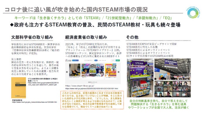 海外では多くの保護者が注目するSTEAMトイ。子どものIQではなく、生きるチカラとも呼ばれるEQ(心のチカラ)を伸ばす知育玩具の最先端商品を体験頂き、STEAMの認知拡大とFan作りを図ります。