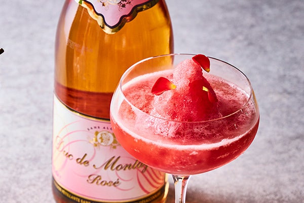 バラ、カシスのシロップにクランベリーとラズベリーを合わせてノンアルコールスパークリングワインで仕上げました。ベリーの甘酸っぱさとバラの香りに包まれた一杯です。