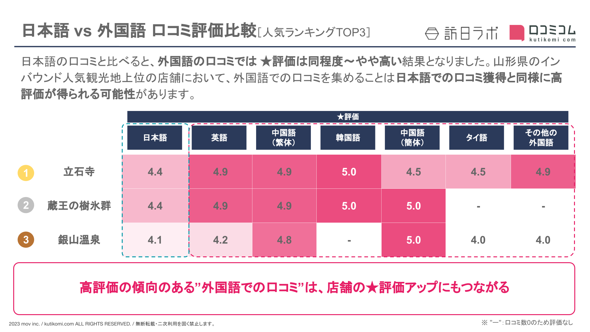 日本語の口コミと比べると、英語や中国語での口コミでは★評価は同程度〜やや高い結果となりました。山形県のインバウンド人気観光地上位の店舗において、外国語での口コミを集めることは日本語での口コミ獲得と同様に高評価が得られる可能性があります。