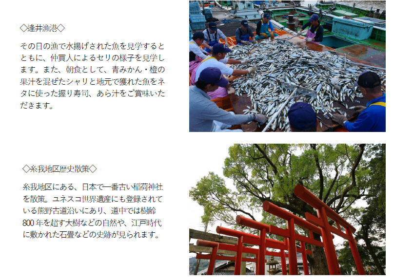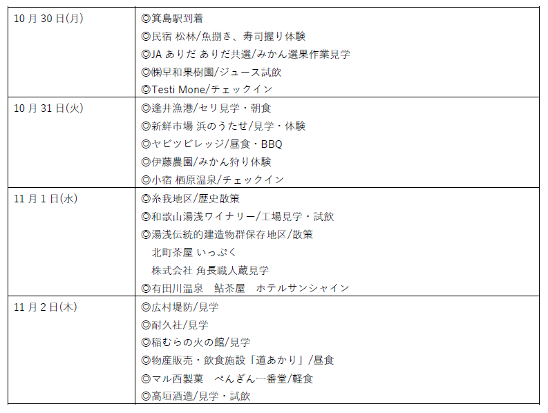 令和5(2023)年度第3回は、和歌山県有田地域(有田市、有田川町、広川町、湯浅町)に、タイのABCクッキングスタジオ会員を招き、10月30日(月)から3泊4日でツアーを開催いたします。有田地域特産のみかんを堪能する体験(みかん狩り・選果作業見学)や、新鮮な海の幸を味わう体験(魚捌き・寿司握り・セリ見学)を予定しているほか、ワイナリーや酒造の見学等、有田地域の魅力がたっぷり詰まったツアーを予定しています。