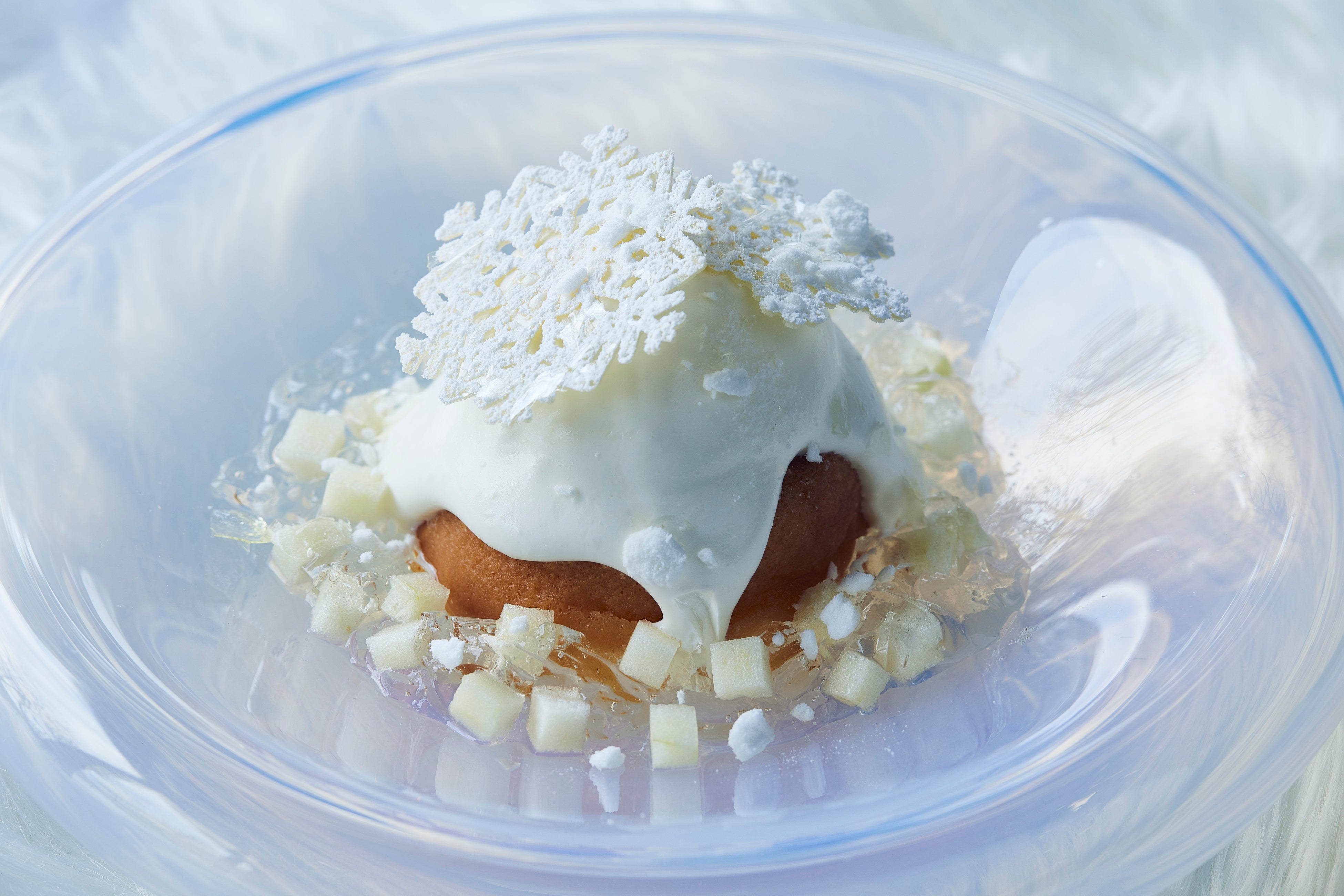 眼下に氷瀑クリスマスツリーを見下ろす空間「ロビー 森の神話」では、クリスマスの夜を楽しく過ごせるように、1日10個の数量限定で氷瀑クリスマスケーキを提供します。ふわふわのシフォンケーキの上に真っ白なシャンティを添え、日の光が当たりきらきらと輝く日中の氷瀑を表現しました。仕上げに冬らしい雪の結晶の形をしたチュイルをのせています。口に含むとりんごの甘酸っぱさと苺の甘い香りが口の中に広がり、味だけでなく見た目も楽しめるクリスマスケーキです。