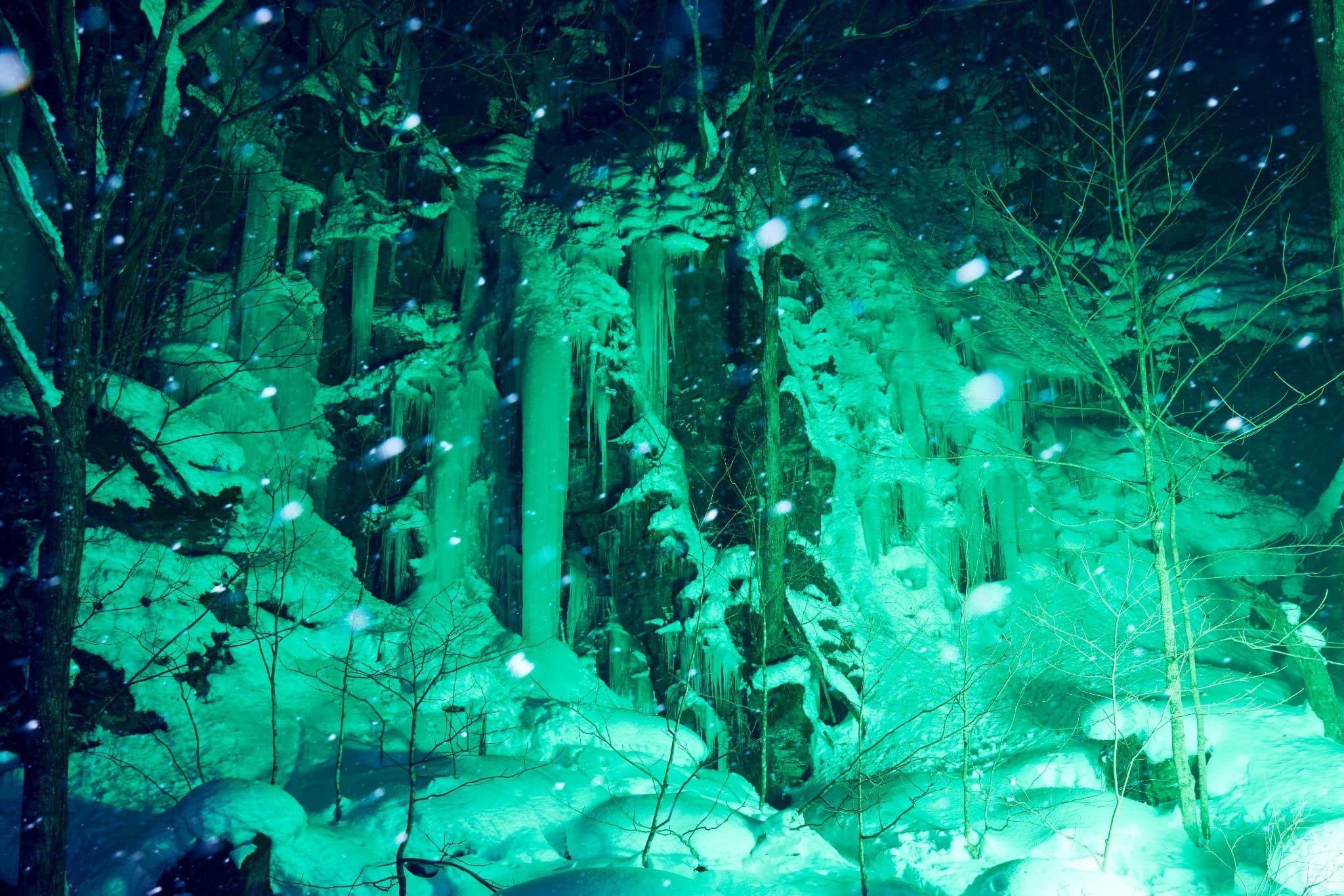 当イベント期間中は、緑を基調にクリスマスの幻想的なイメージを表現した特別なライトアップで氷瀑を彩ります。これは「氷瀑ライトアップツアー」の21時の便限定で行う、クリスマスカラーに彩られた氷瀑を楽しめる特別なツアーです。カウントダウンに合わせて、普段見ることができないクリスマスカラーで氷瀑を幻想的に照らし出し、特別なクリスマスの夜を演出します。