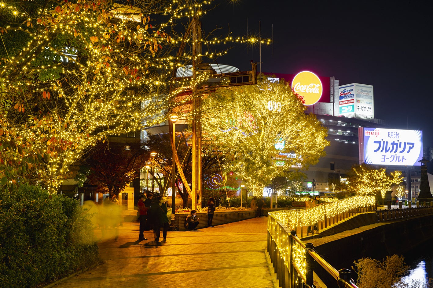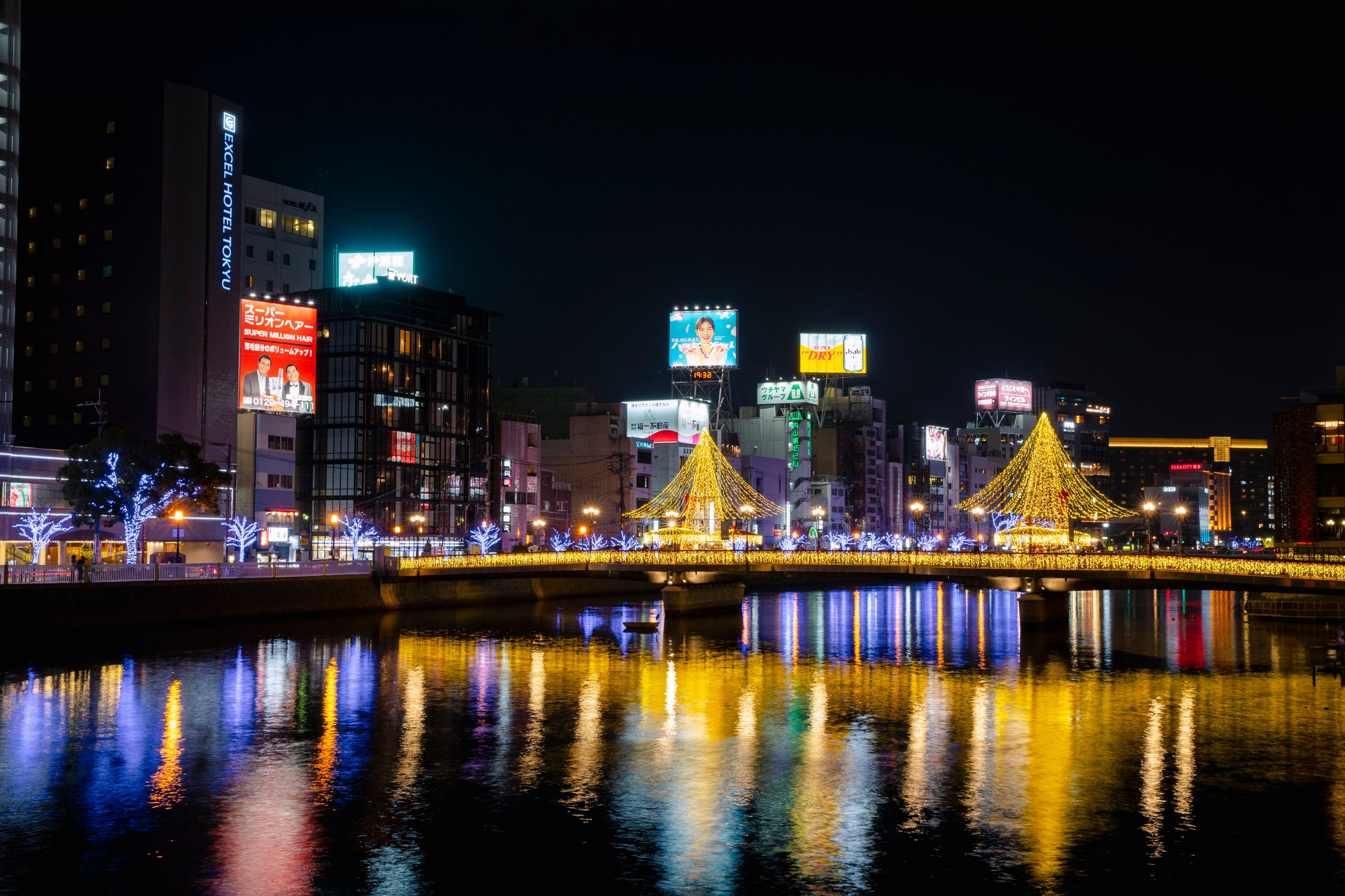 2020年より開催されている「ナカスキボウノヒカリ」は「ナカス ヒカリノ アドベント」(企画・運営:株式会社Mr.Weihnachtsmann、福岡市中央区清川、総合プロデューサー 佐伯岳大)と改称し、4年目となる2023年は中洲中央通り、那珂川通り、明治通り、福博であい橋の中洲地区を、きらびやかなイルミネーションで照らします。清流公園の屋台が並ぶ川沿いまでライトアップが続き、橋の上からの景色は見ものです。2023年11月6日(月)から始まる博多、16日(木)から天神中央公園、そして17日(金)からは天神の各会場とつながります。