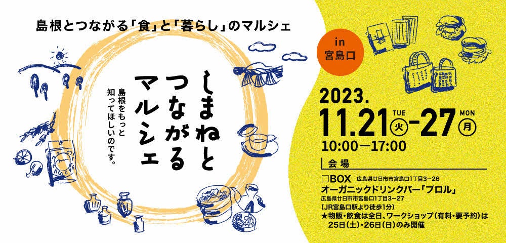 本イベントでは、島根の食や人、暮らしに触れ、県の認知度向上と関係人口拡大を目的とし、「しまねとつながる」をテーマに、物販や飲食の他、島根を知り学んでいただくワークショップも実施します。