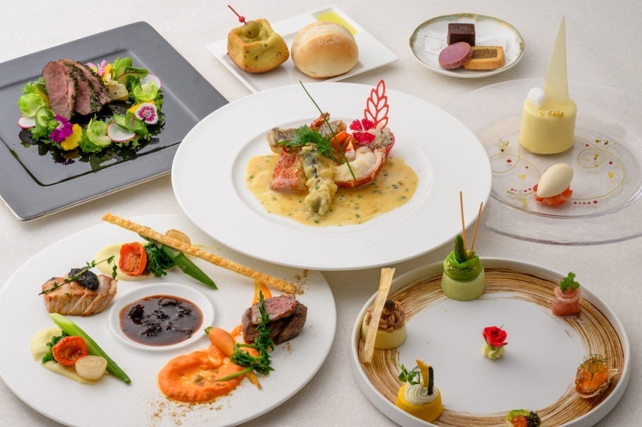 『紡ぐ(つむぐ)』をコンセプトにしたクリスマスディナー。クリスマスリースの形をしたサラダ仕立ての温前菜には、口どけの良い脂身と柔らかな赤身とのバランスが良いフィレ・ド・カナール(鴨肉)を使用。ロブスターは香り高い王朝味噌のバターソースと、島豚スモーク入りトリュフリゾットとともにお召し上がりください。本部牛サーロインは、フランスの高級食材の一つ「モリーユ茸」入りクリームソースとのハーモニーを、イベリコ豚のソテーはオリーブが香るデュクセルとのハーモニーをお楽しみいただけます。デザートは、真っ白な雪景色の中に立つクリスマスツリーを模したホワイトチョコをチョコムースにあしらいました。レモンミルクソルベとのハーモニーもご堪能ください。