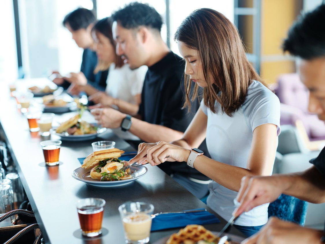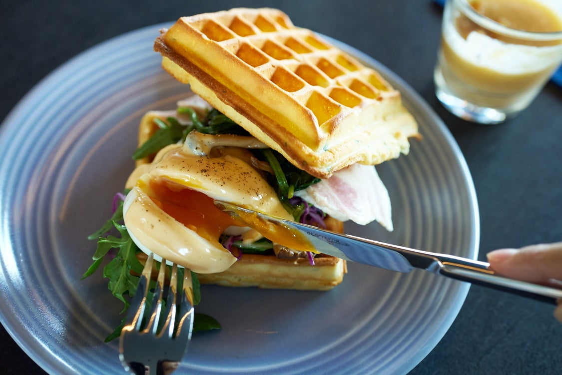 ピラティスでからだを動かした後は、14階のガラス張りの開放的な空間「THE LIVELY BAR」にて、本イベントのために考案されたグルテンフリー料理「米粉ワッフルのエッグベネディグト 季節の野菜とジャンボンブラン添え」「柿とヨーグルトのスープ メープルの香り」を召し上がっていただきます。アレルギーがあり食事内容を気を付けている方や健康的にヘルシーでおいしいものを食べたい方向けのグルテンフリー料理は、運動後の食事にもぴったり。シェフこだわりのからだを労る本格フレンチをご堪能ください。お食事の時間は、参加者同士の交流の場としてもご活用いただけます。