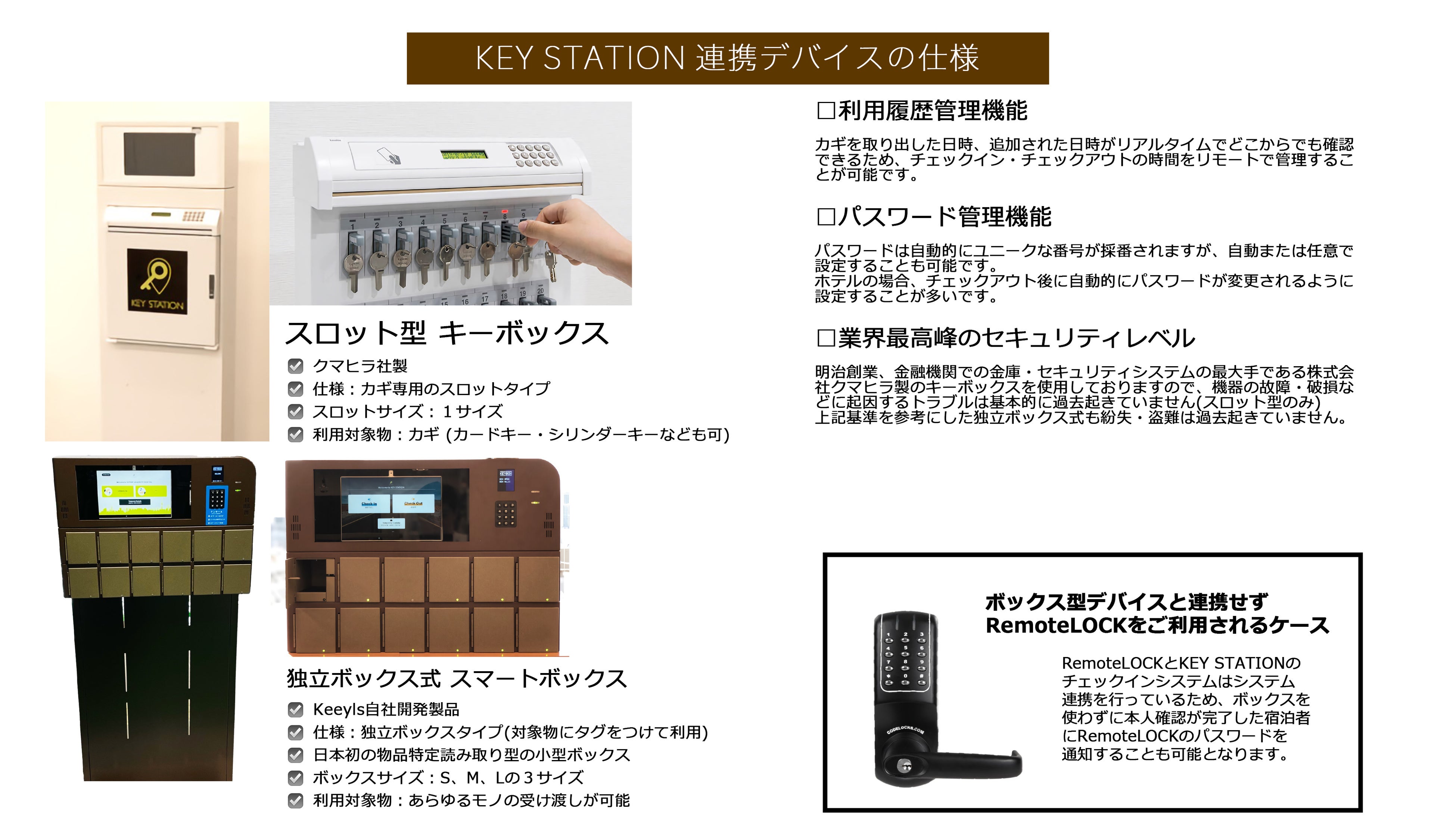 KEY STATIONの一部の機能として物理キーをそのままボックスに入れることにより、ホテルのフロント業務である予約管理・チェックイン・カギの受け渡し・チェックアウトまでを無人で完結できます。