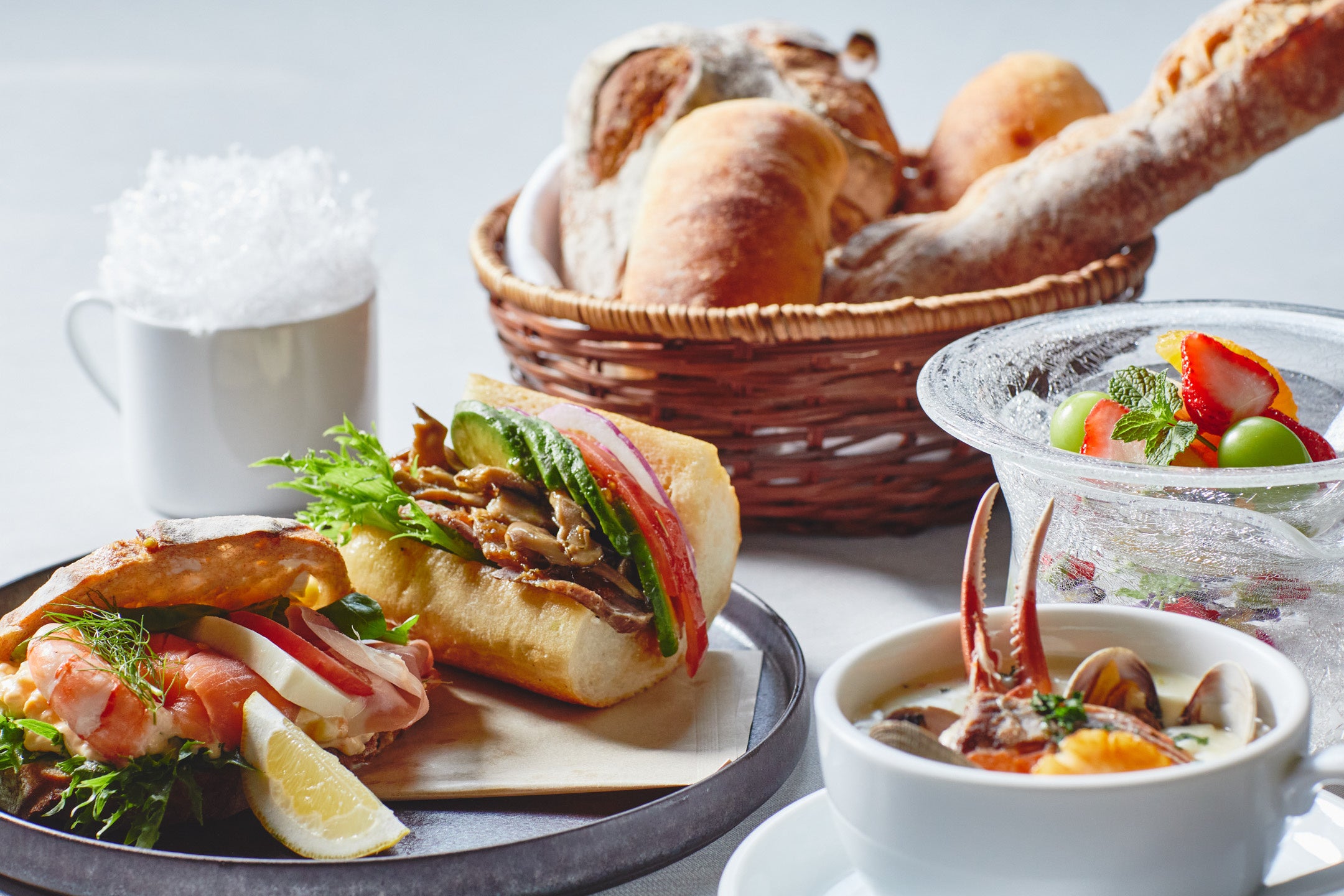 朝一番の滑走後は、霧氷テラスにある「雲Cafe」にて、霧氷が作り出す雪山の絶景を鑑賞しながら、ゆっくりと絶景ブランチを味わいます。蟹、ホタテなど北海道の海鮮が入ったクラムチャウダーは、冷えた身体を芯から温めてくれる贅沢なスープです。また、厚切りのジンギスカンを挟んだジンギスカンサンド、サーモンとエビを挟んだボリューム満点なサーモンシュリンプサンドは、滑走後の空腹を満たしてくれます。雪景色の中、パウダースノー滑走後の余韻に浸りながら食べる絶景ブランチは、トマムならではの贅沢です。