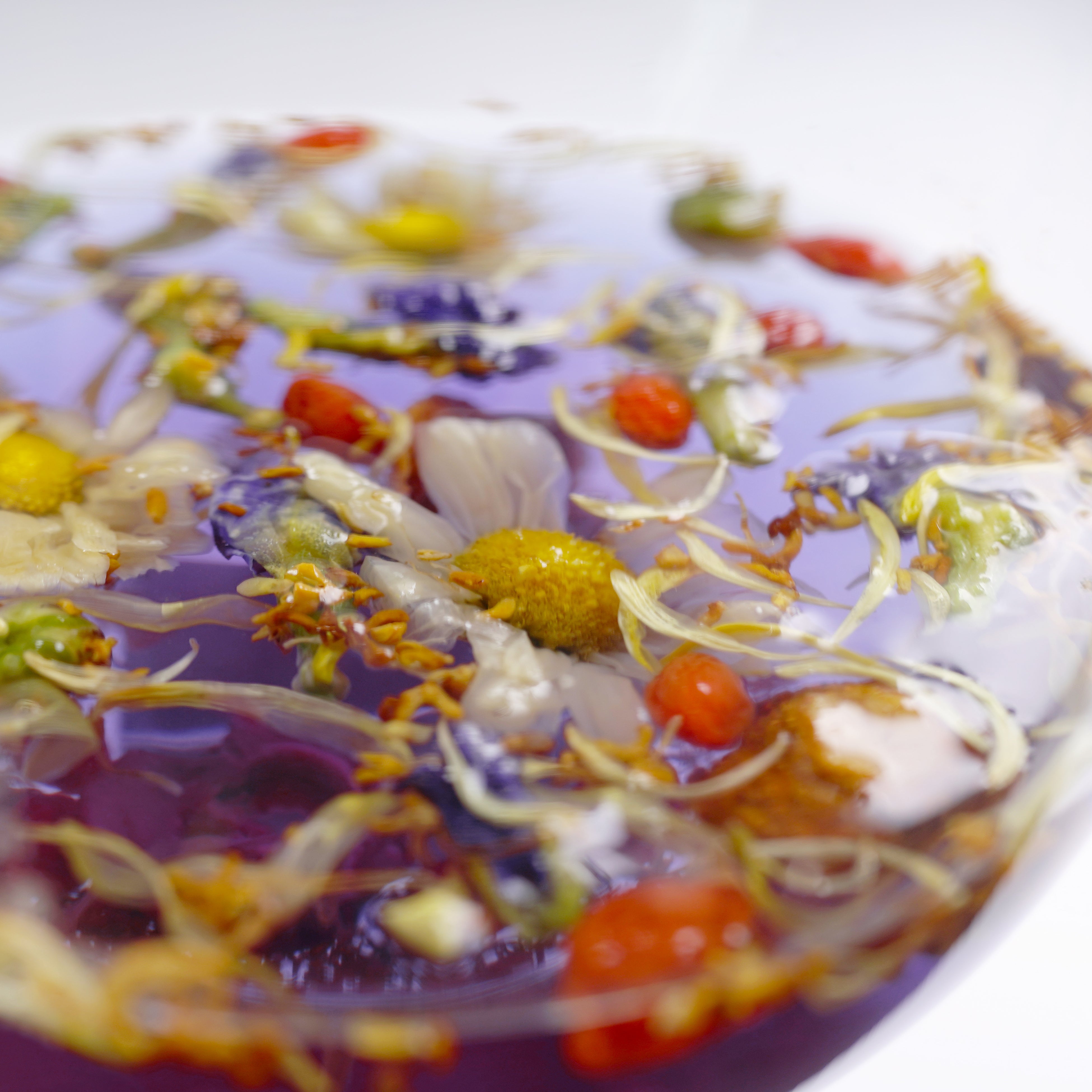 (深い⻘紫⾊から⾚紫⾊へ⾊の変化を楽しめるお茶)