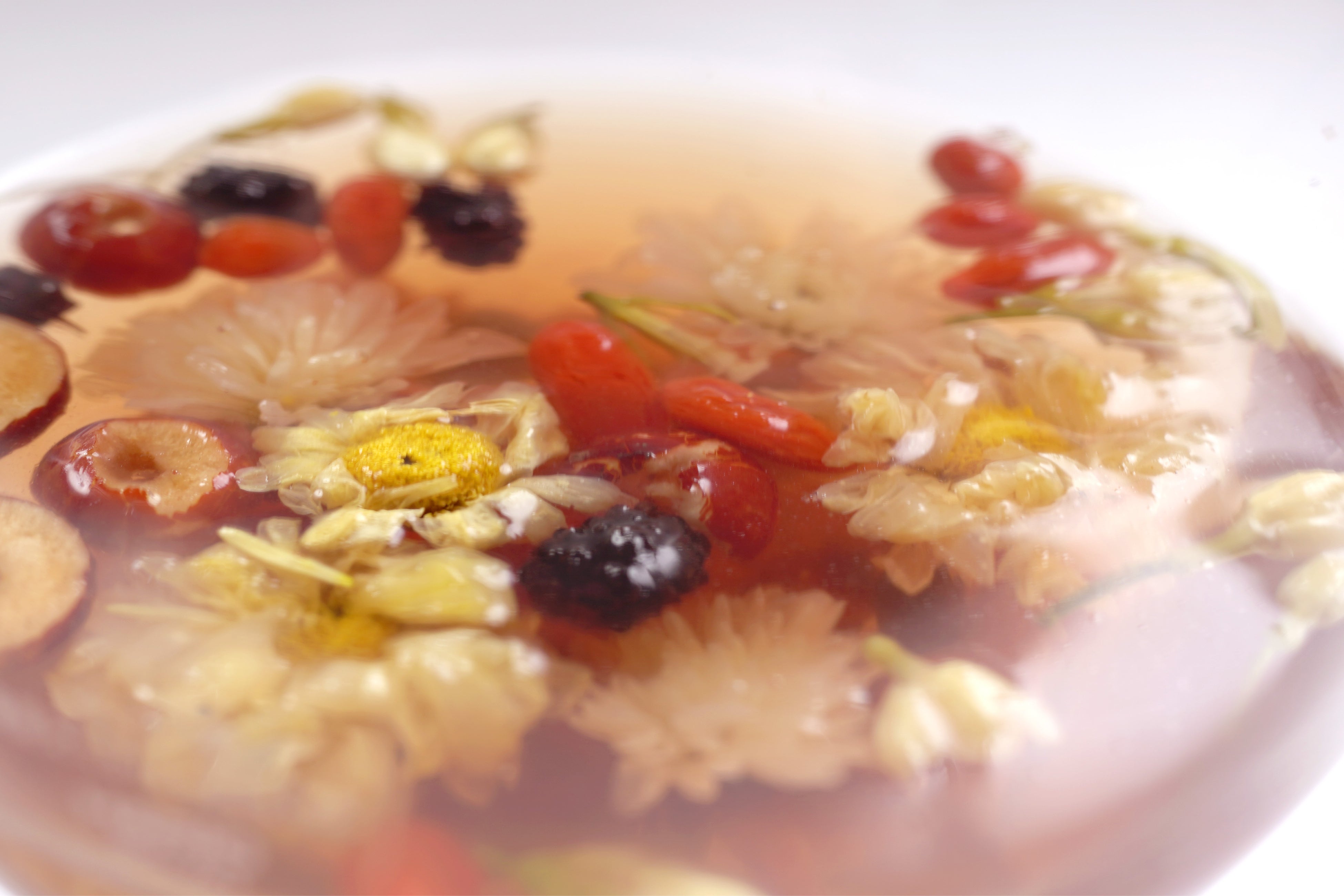 ブルーベリーにはビタミンEが多く含まれており、クランベリーは抗酸化作用をもつポリフェノールやビタミン類が豊富です。他にも皮膚・粘膜・目の健康に良いビタミンAを多く含む菊類のお花などを合わせました。